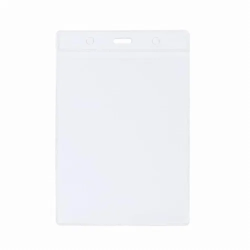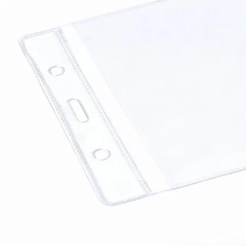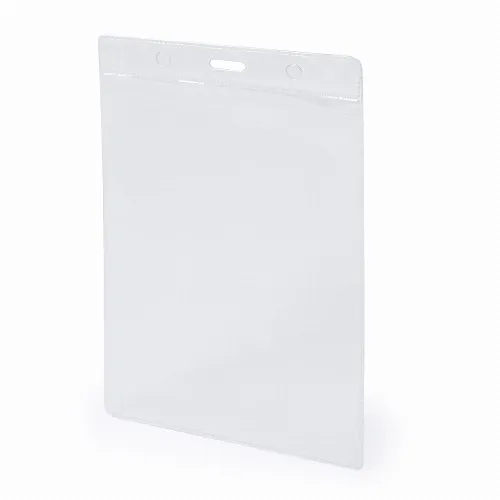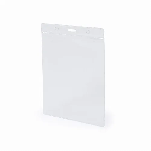 Practical badge holder with reinforced top and perforations for both central and side fastening.