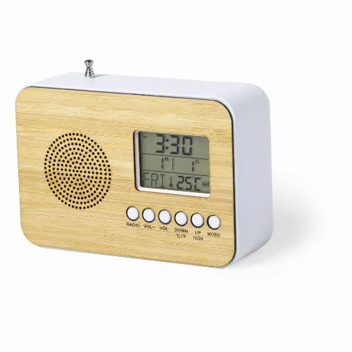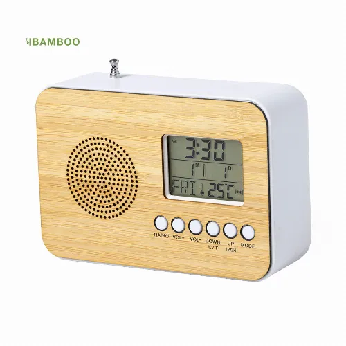 Functions: alarm, calendar, thermometer and FM radio, with retractable antenna. Battery powered (2xAAA not included) and presented in an attractive, individual, eco-design box.