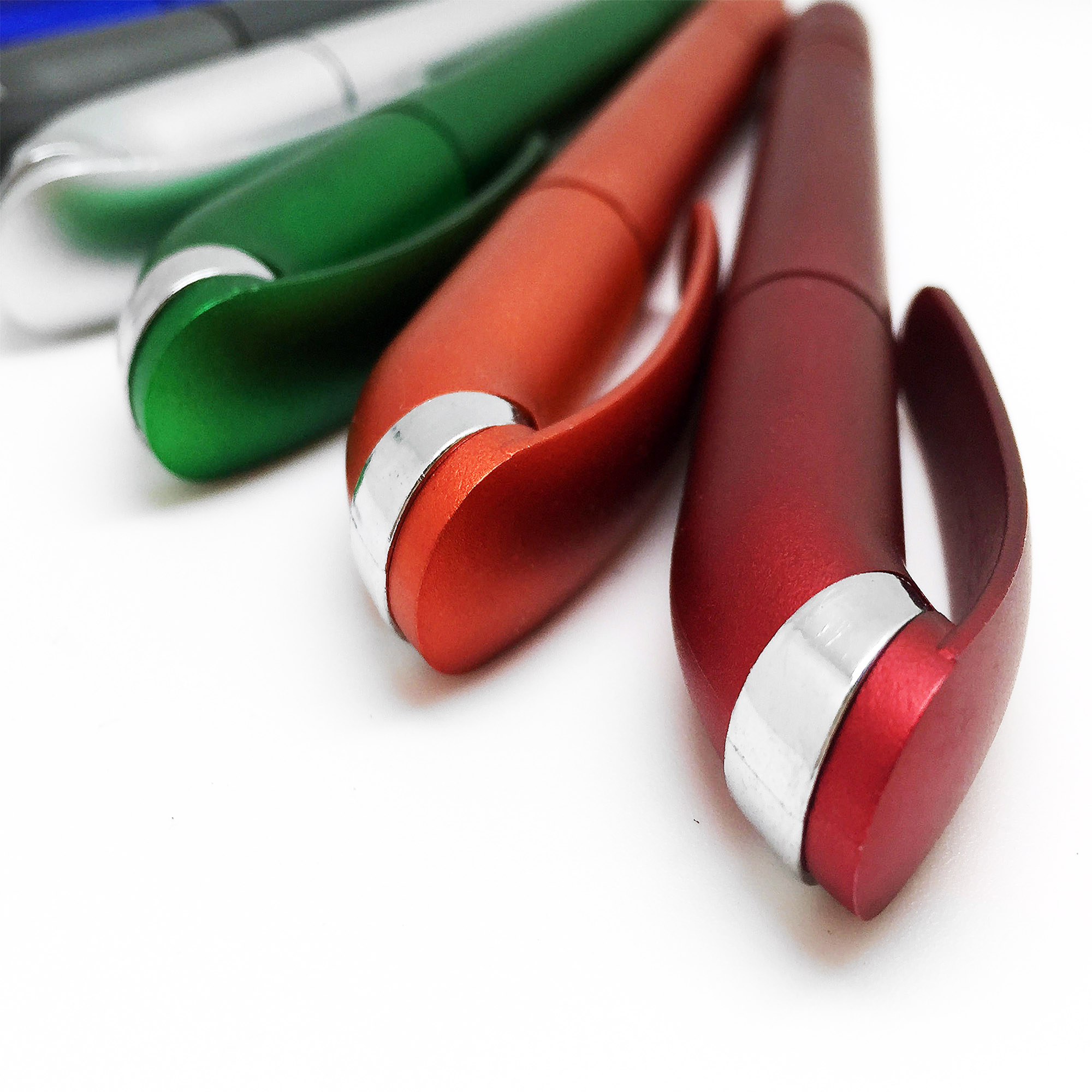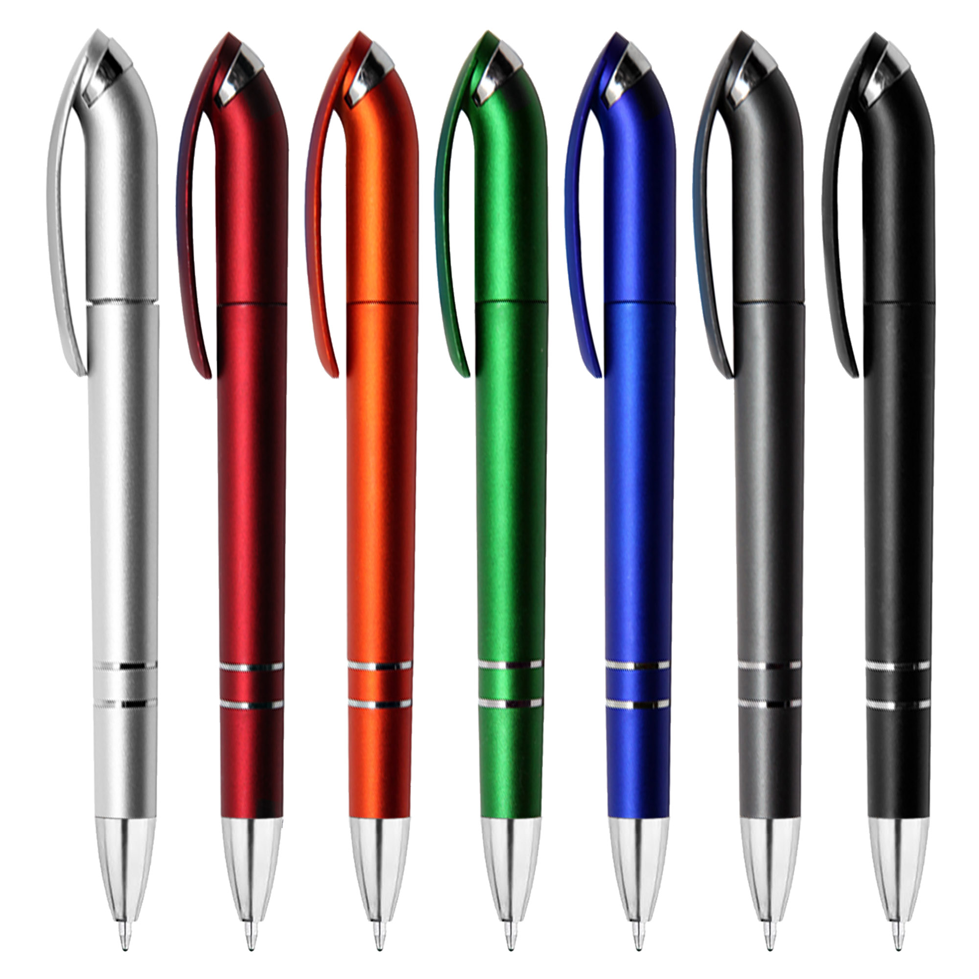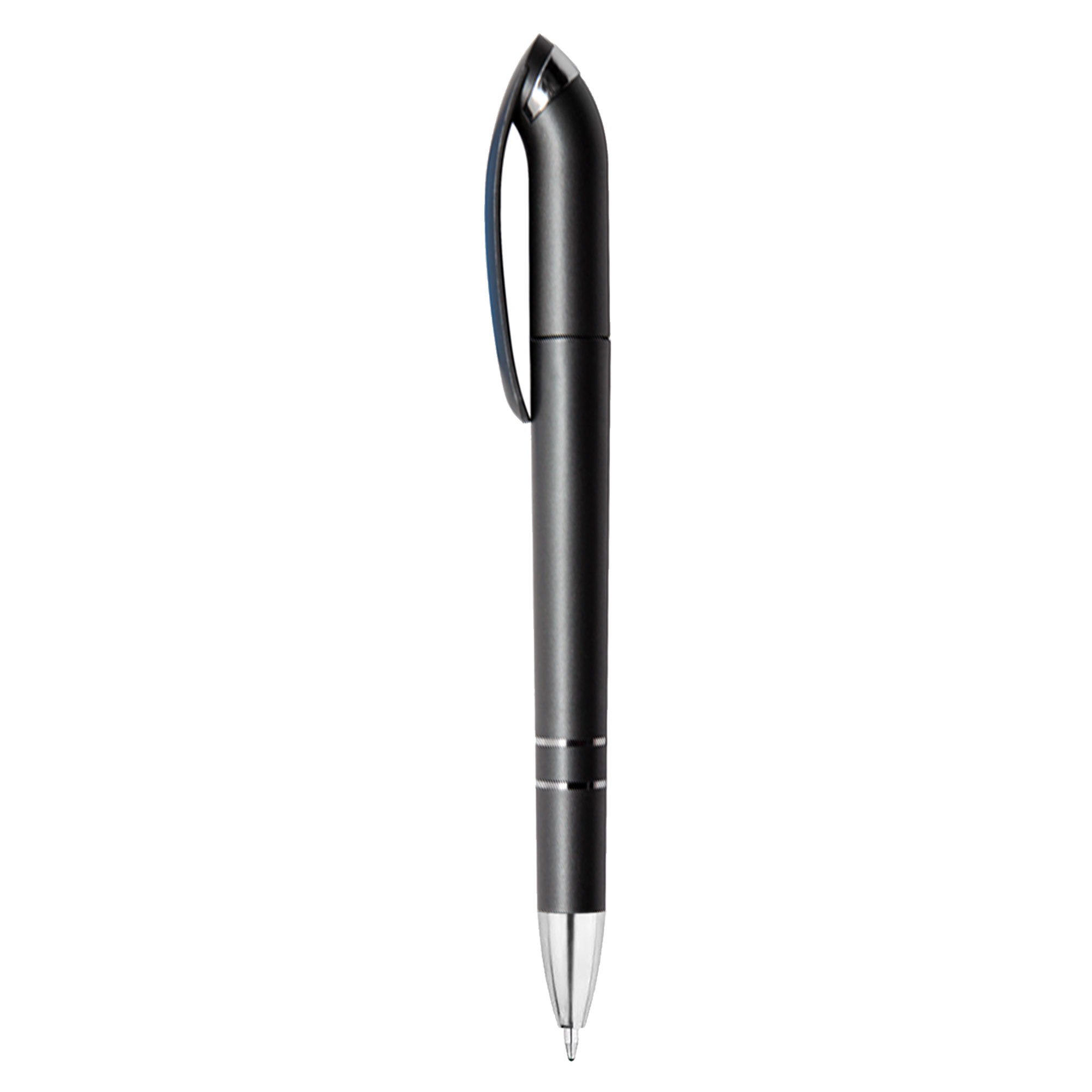A quality European style pen twist action solid metallic finishing plastic pen with shiny chrome tip and two rings on barrel and one ring on neck. It has high quality German manufactured black ink refill 1800 meters writing distance tungsten carbide ball provides you with quality writing. An absolutely impressive design pen is ready for your next event.