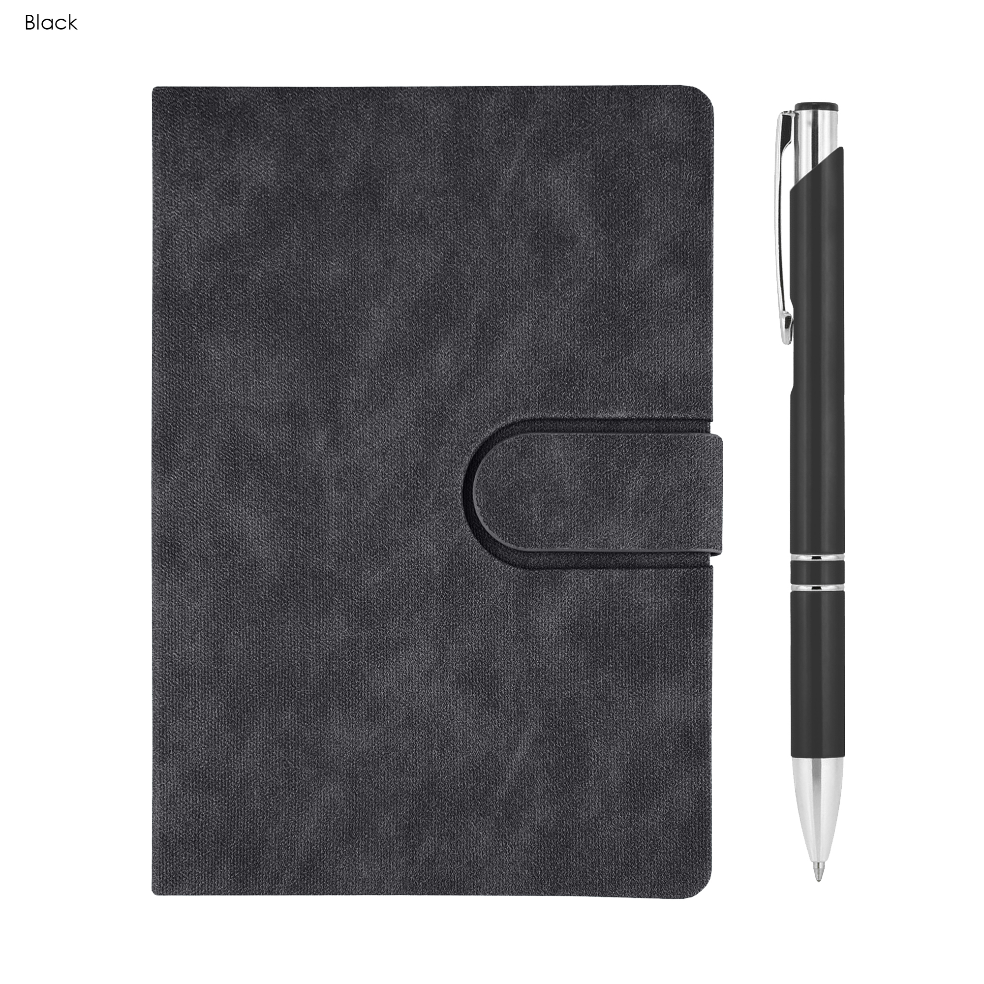 This modern A5 notebook features a hard PU leather cover with magnetic flip closure, 160 pages of 80gsm lined off white paper, and a matching fabric bookmark. Paired with a stylish aluminium pen with a Parker Type German refill, both are presented in a durable black cardboard gift box, perfect for gifting.