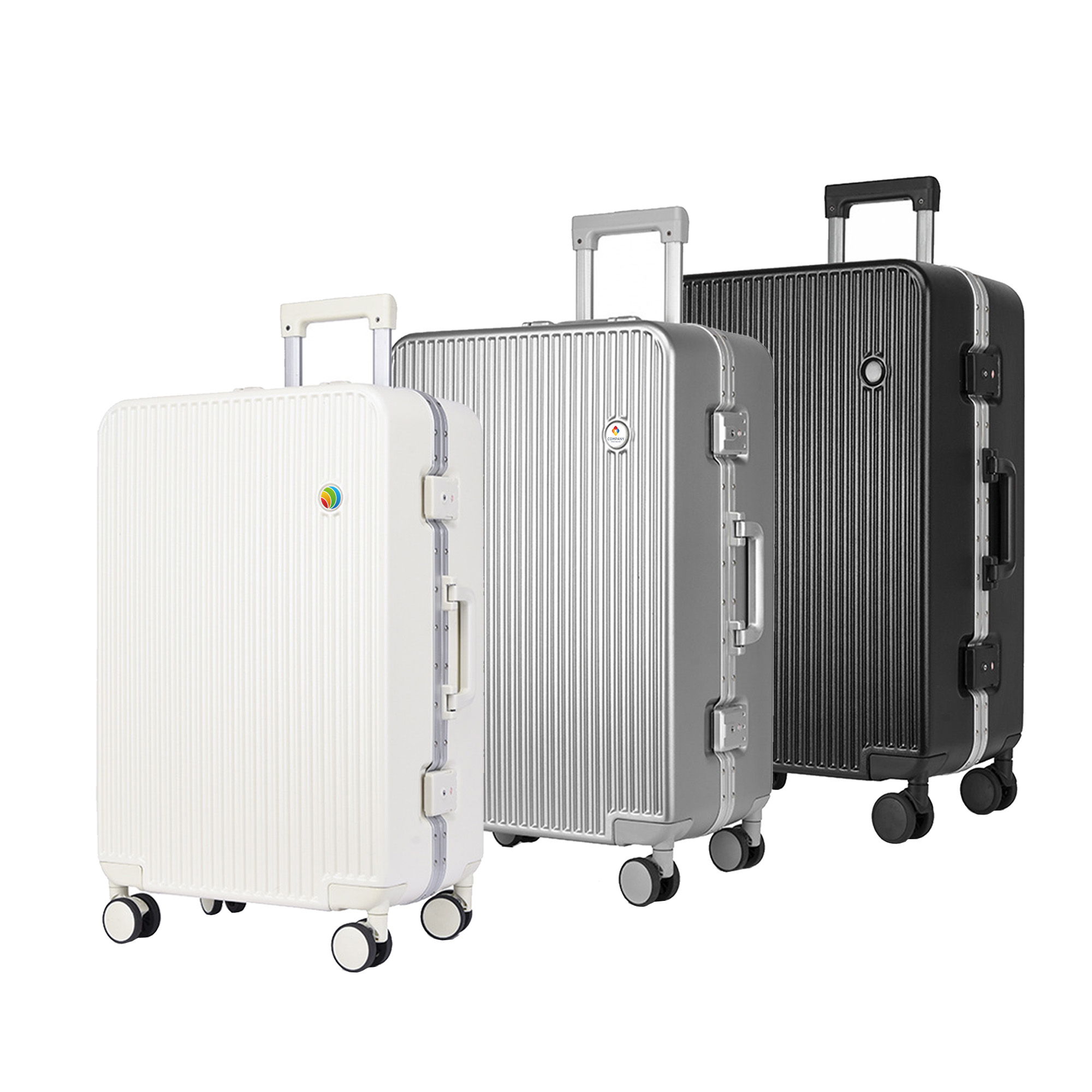 Use our Ribbed Suitcase will make your next journey a breeze. The suitcase uses a 28mm diameter epoxy doming to customize your logo. It is made of ABS, PC materials and alloy aluminum frame, equipped with 4 silent universal wheels, which effectively reduces noise while in use, and can be rotated or pushed horizontally easily and comfortably. Equipped with two ordinary combination locks, upper and lower, you can keep your luggage well protected. It comes in three sizes: 20/24/26 inches to meet your different needs. The main compartment of the suitcase has a zippered mesh pocket and a waterproof bag. Available colors are black, white, and gray. Great for getting your branding seen on the go.