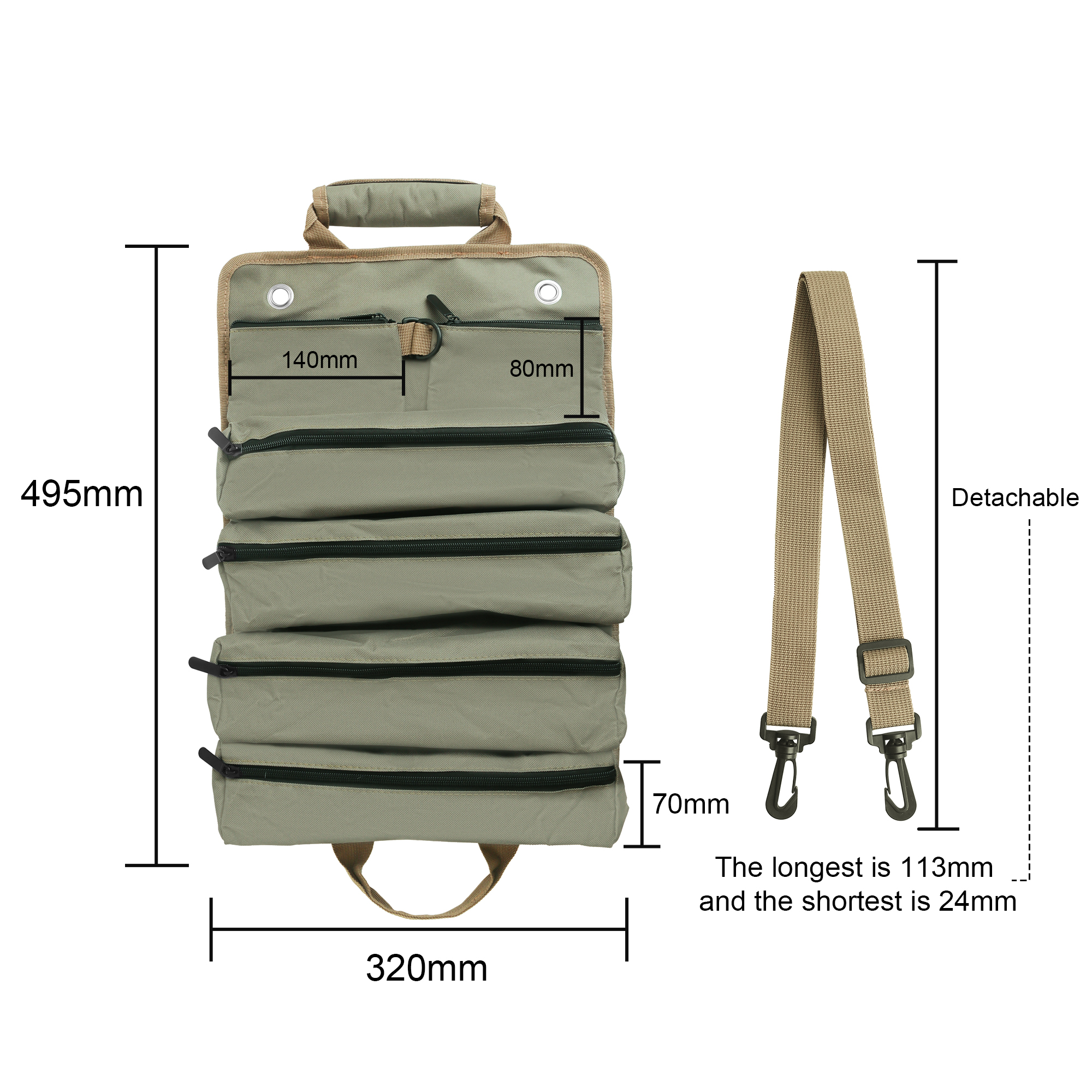 Keep your tools organized with our durable rolling up tool bags!The removable shoulder strap adjusts from 24 cm to 113 cm. Black,khaki and army green to choose from. With 5 zipper pockets, this bag can help keep tools organized and easily accessible. Great for professionals and weekend warriors alike