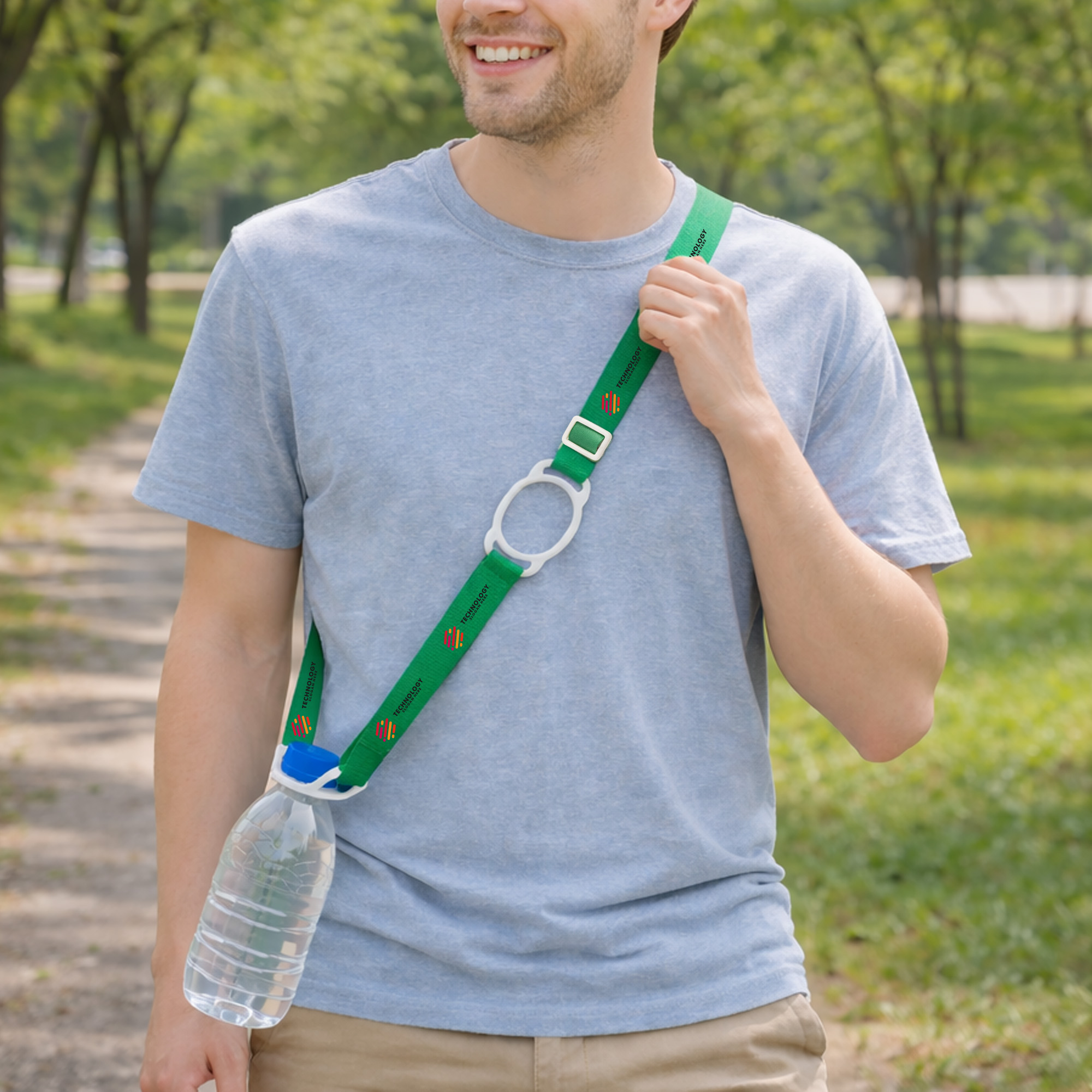 Carry your water bottle with our 2 in 1 Water Bottle Lanyard, crafted from recycled RPET and silicone materials. Featuring an adjustable strap and two flexible silicone rings with diameters of 2.5cm and 5cm, our lanyard fits different bottle sizes and allows easy carrying during activities. Personalise the lanyard with sublimation to showcase your logos or brand messages. Ideal for sporting events, walking or daily commutes, our lanyard presents your brand in any environment.