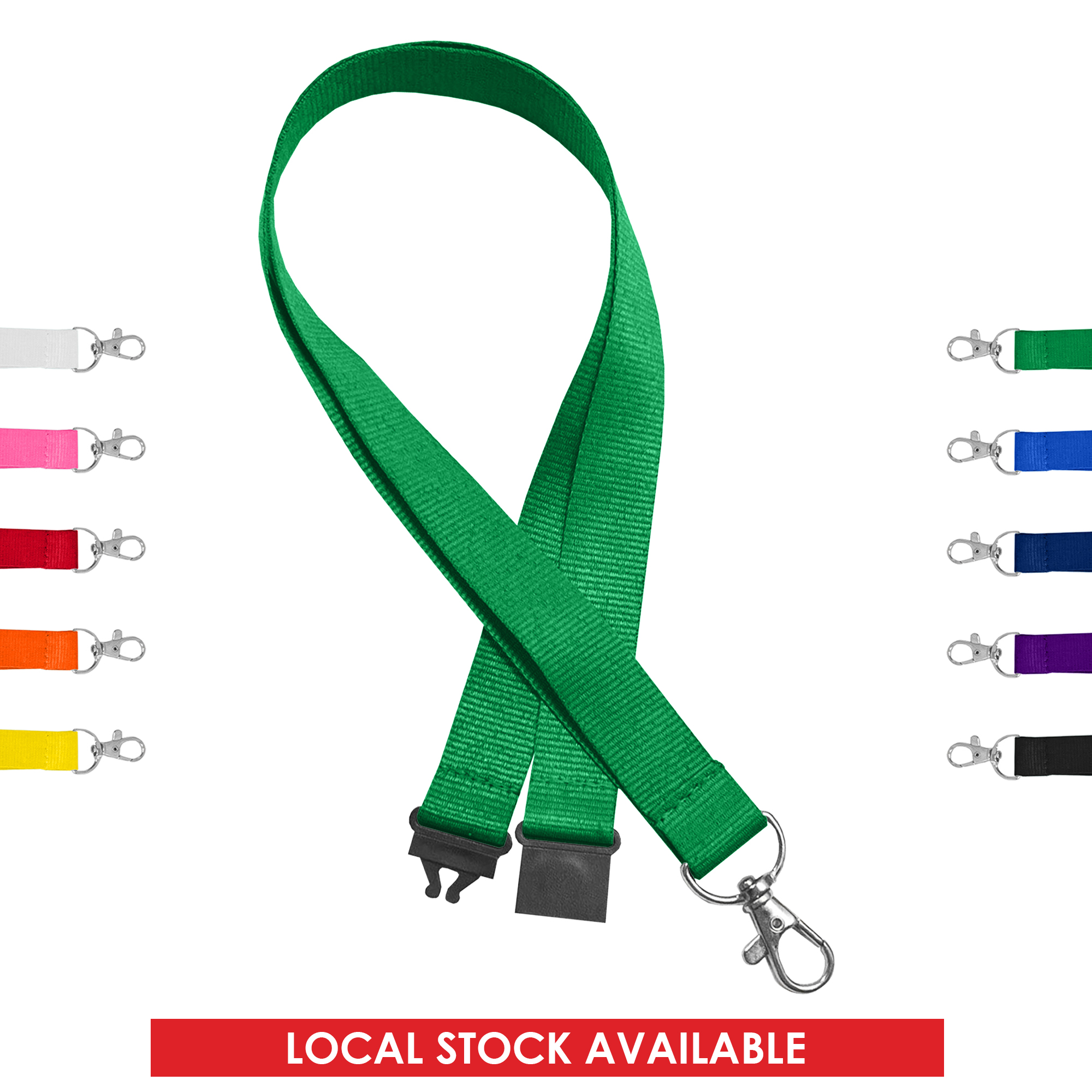 20mm wide lanyard that is manufactured from RPET which is an eco-friendly material produced from recycled water bottles. Comes stock with metal thumb trigger clip and black safety breakaway.