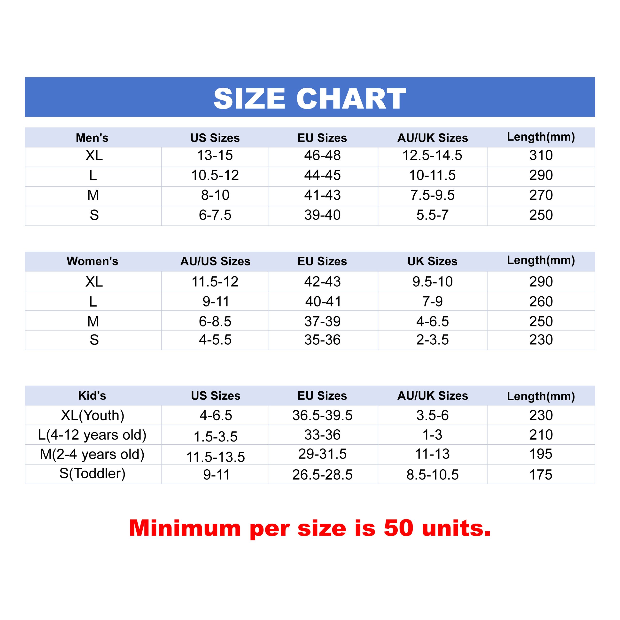 Please note, minimum per size is 50 units. Shoe size quantity selection is for reference only and depends on factors such as pattern and material. Please note that rubber will initially have a plastical odour, which will fade over time.