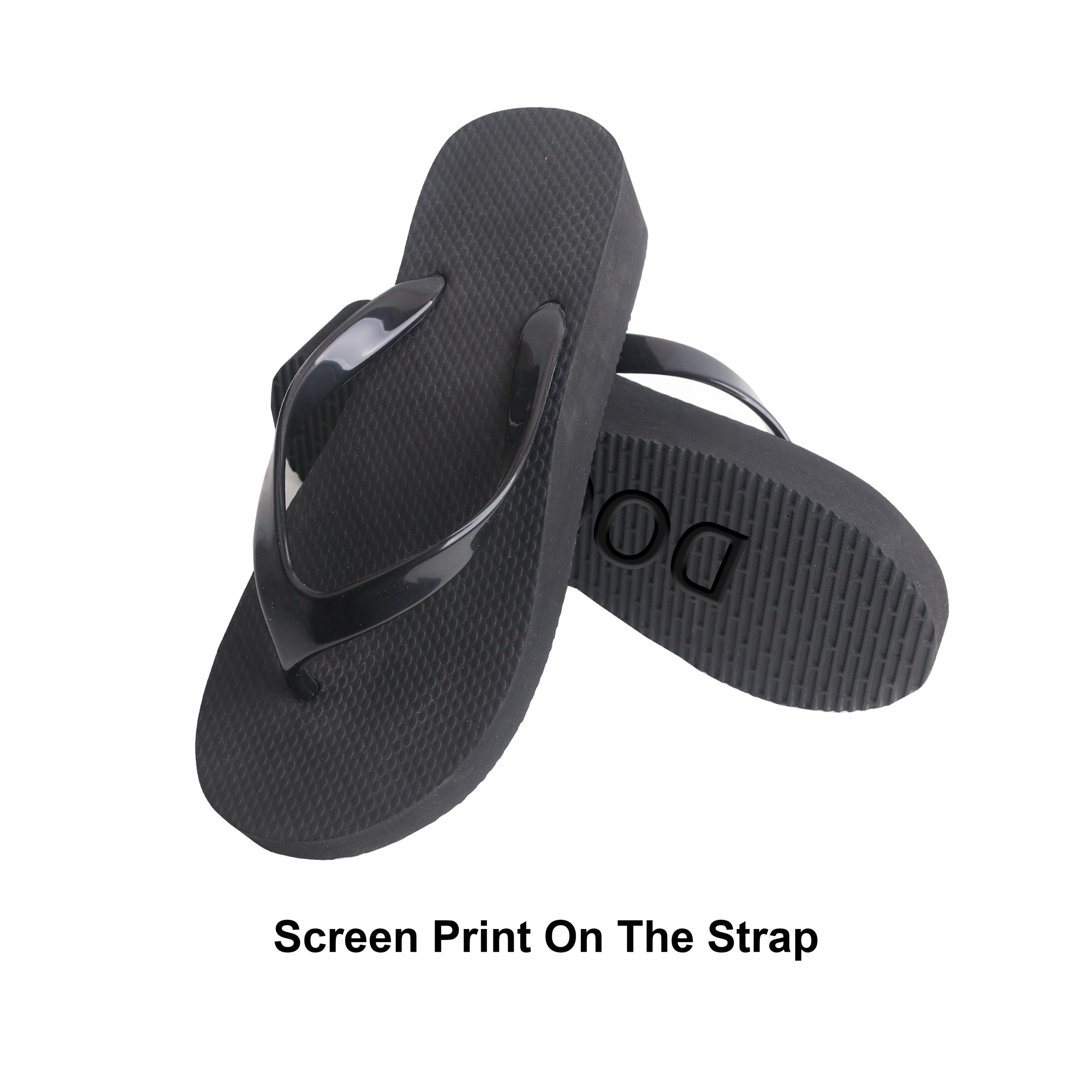 Screen print / UV print on the sole: Full size <br/>Die cut logo on base of the sole: Best fit <br/>Screen print on the side: Full size <br/>Screen print on the strap: 7 x 1 cm