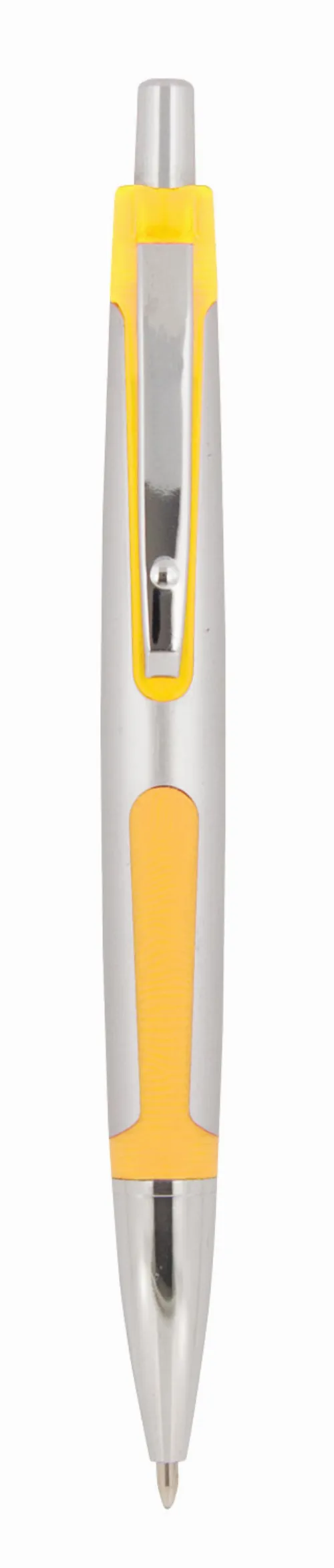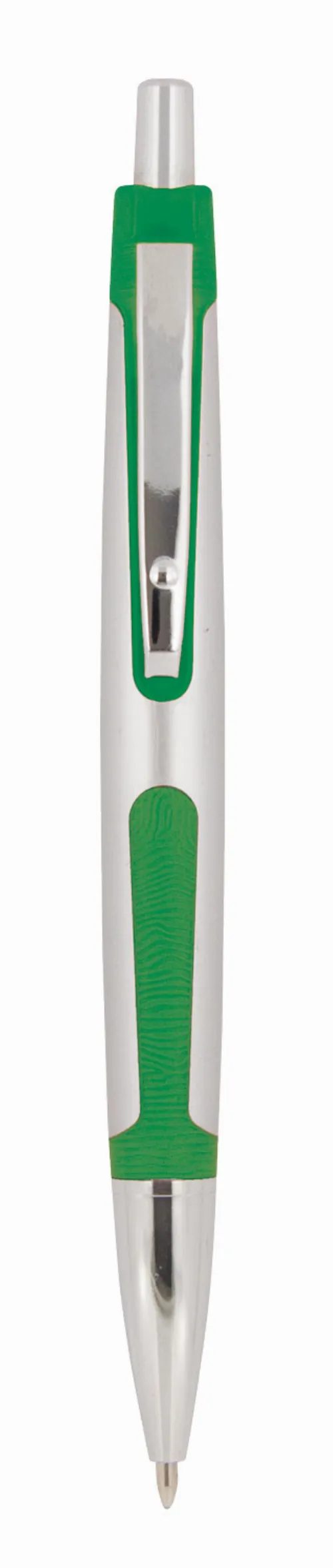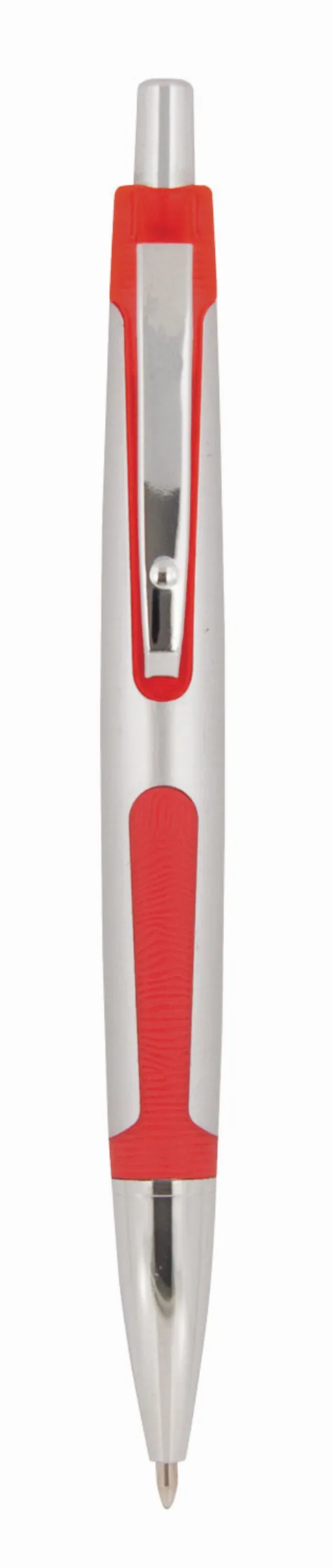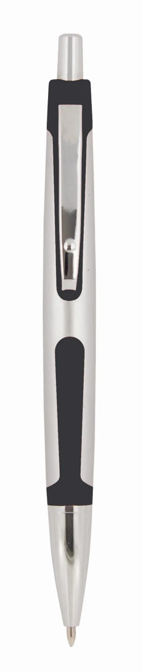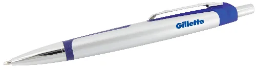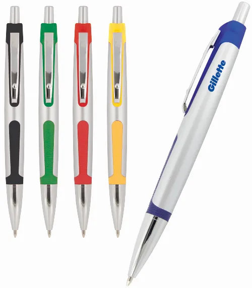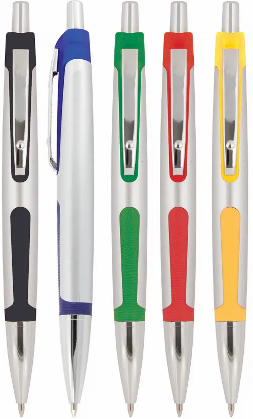 Plastic ballpoint pen, click action with a silver barrel in a satin finish barrel. The coloured rubber trim and silver clip give this pen a stylish and modern appearance. Parker style black refill.