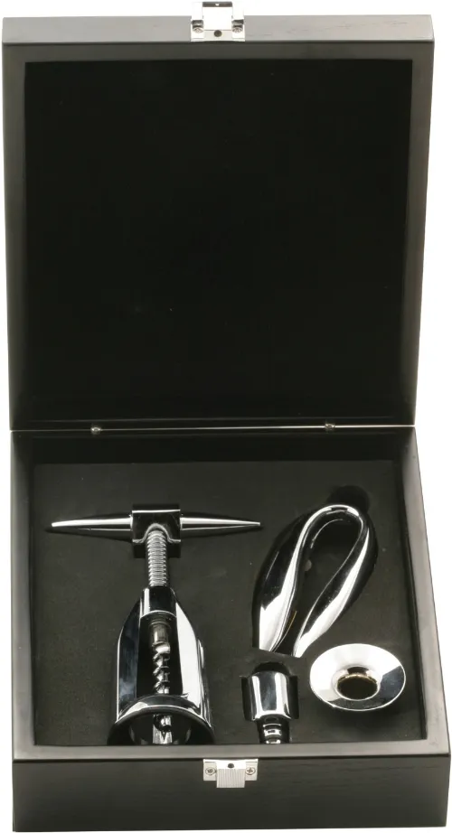 Corkscrew, foil cutter, pourer, stopper, presented in a black timber box. Boxed.