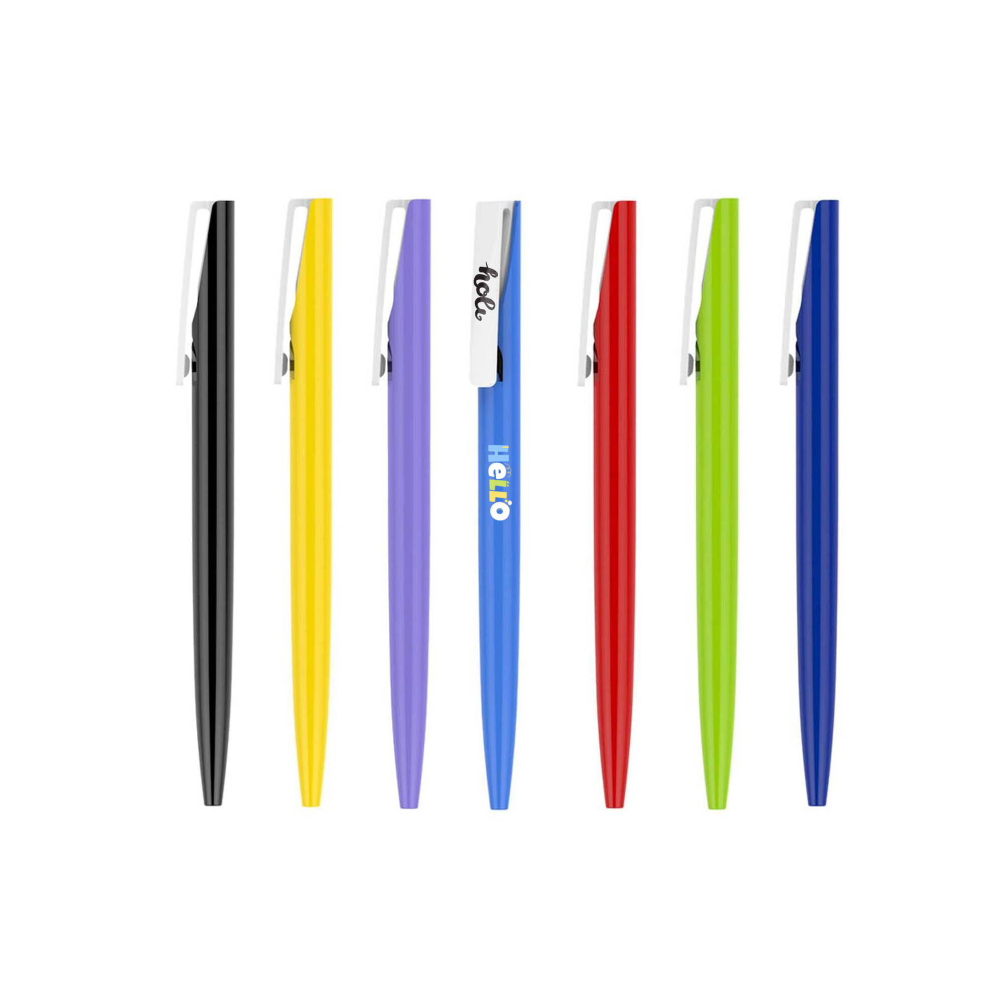[description] => Slim line plastic push action pen with frosted barrel and large colour clip and matching rubber grip. Black refill.