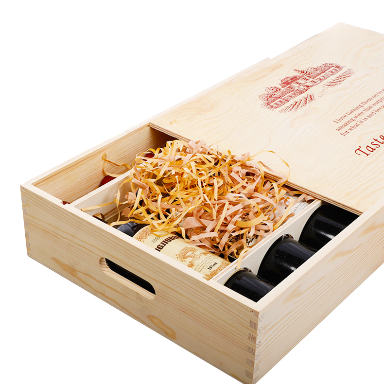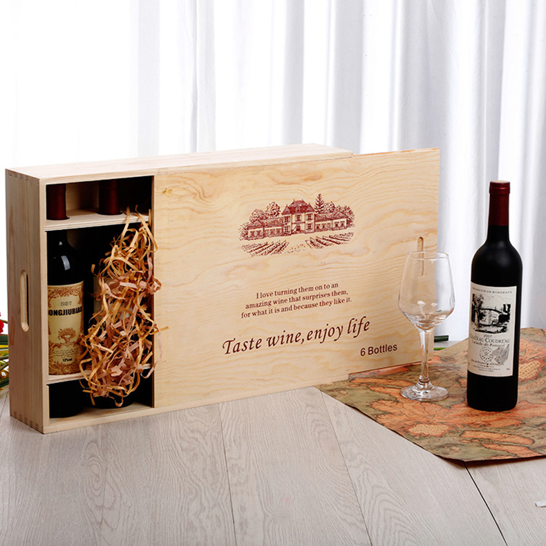 This six-pack wooden wine box is made of selected wood and polished by hand. With fine workmanship, it is your unique and exclusive high-end gift box. It has an inner liner according to the wine bottle, which holds the wine in place and prevents breakage. The pull cover is designed for easy opening. Supports custom logos.