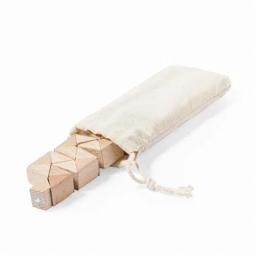 Made of wood and presented in a durable natural cotton pouch with drawstring closure.