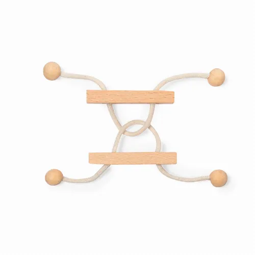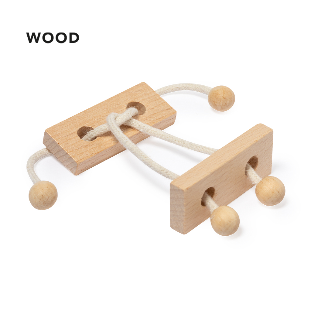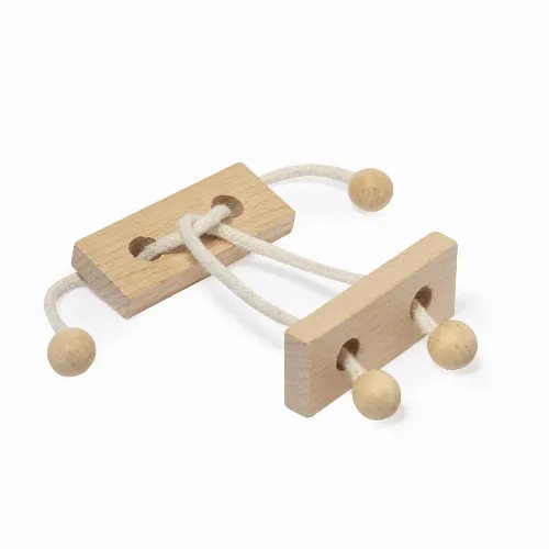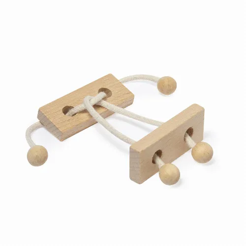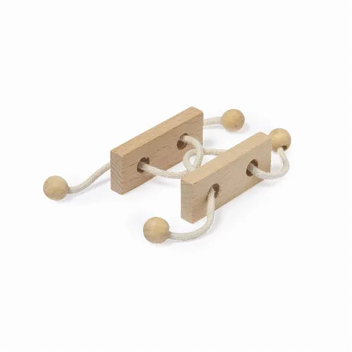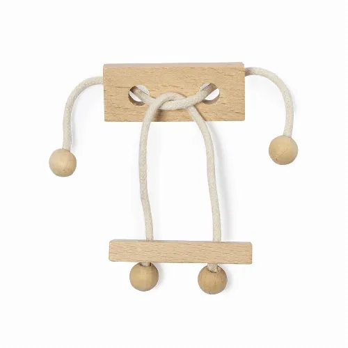 Fun puzzle of two pieces joined by a wooden string, with the objective of finding the way to separate the two pieces. Presented individually in a kraft design box.