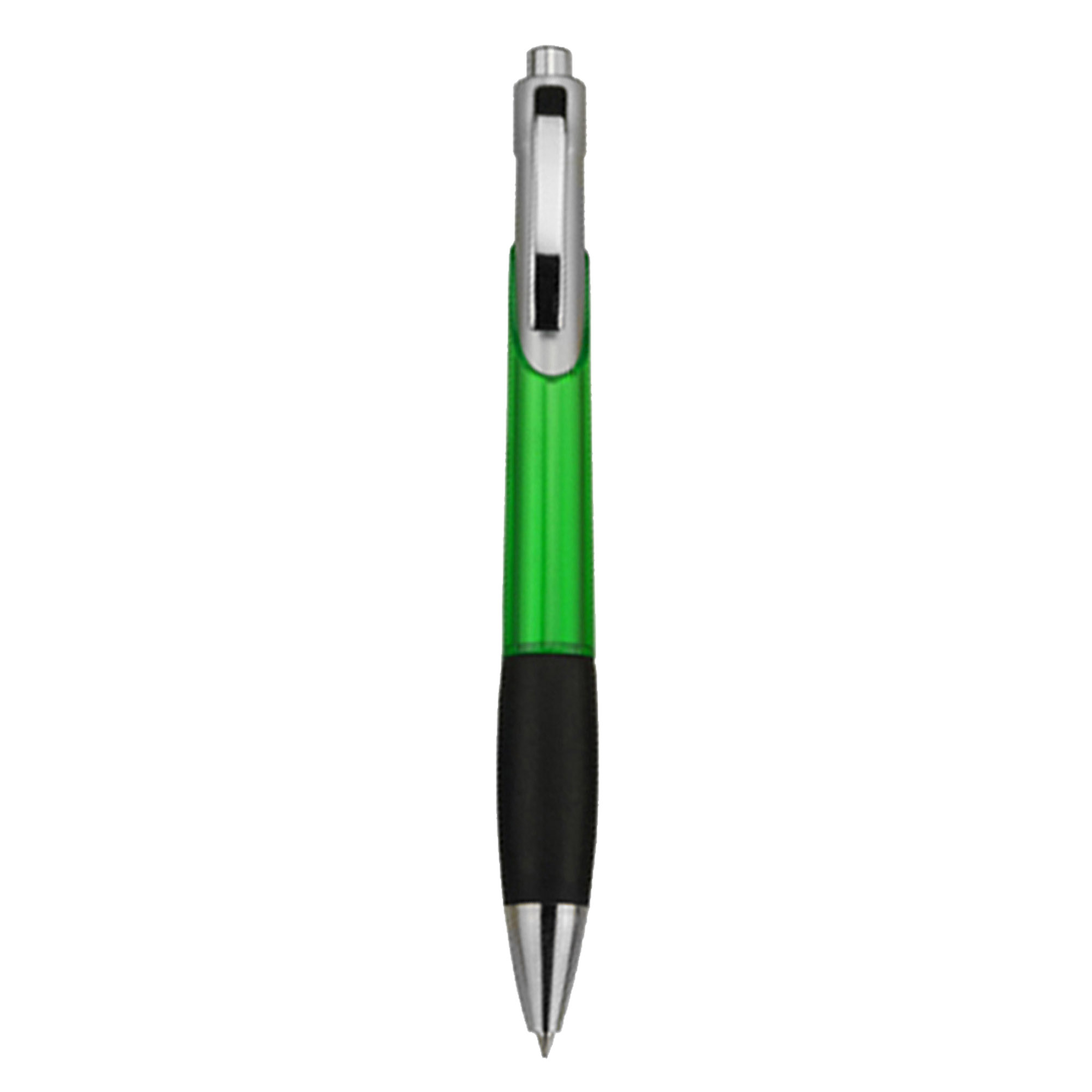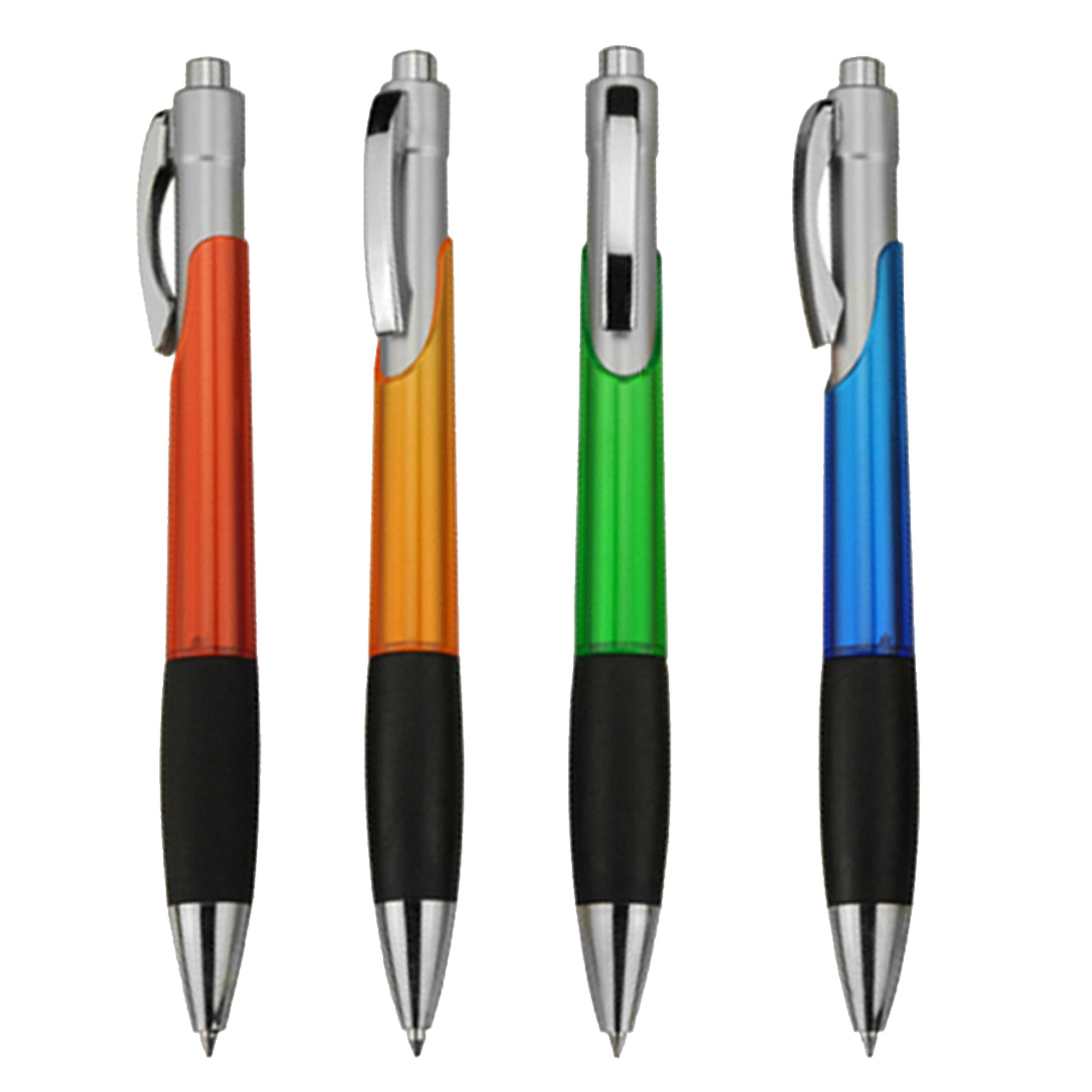 A unique barrel design push action plastic pen translucent coloured body with shiny silver chrome fittings and black soft-touch rubber grip high quality German manufactured black ink refill 1800 meters writing distance tungsten carbide ball provides you with quality writing.