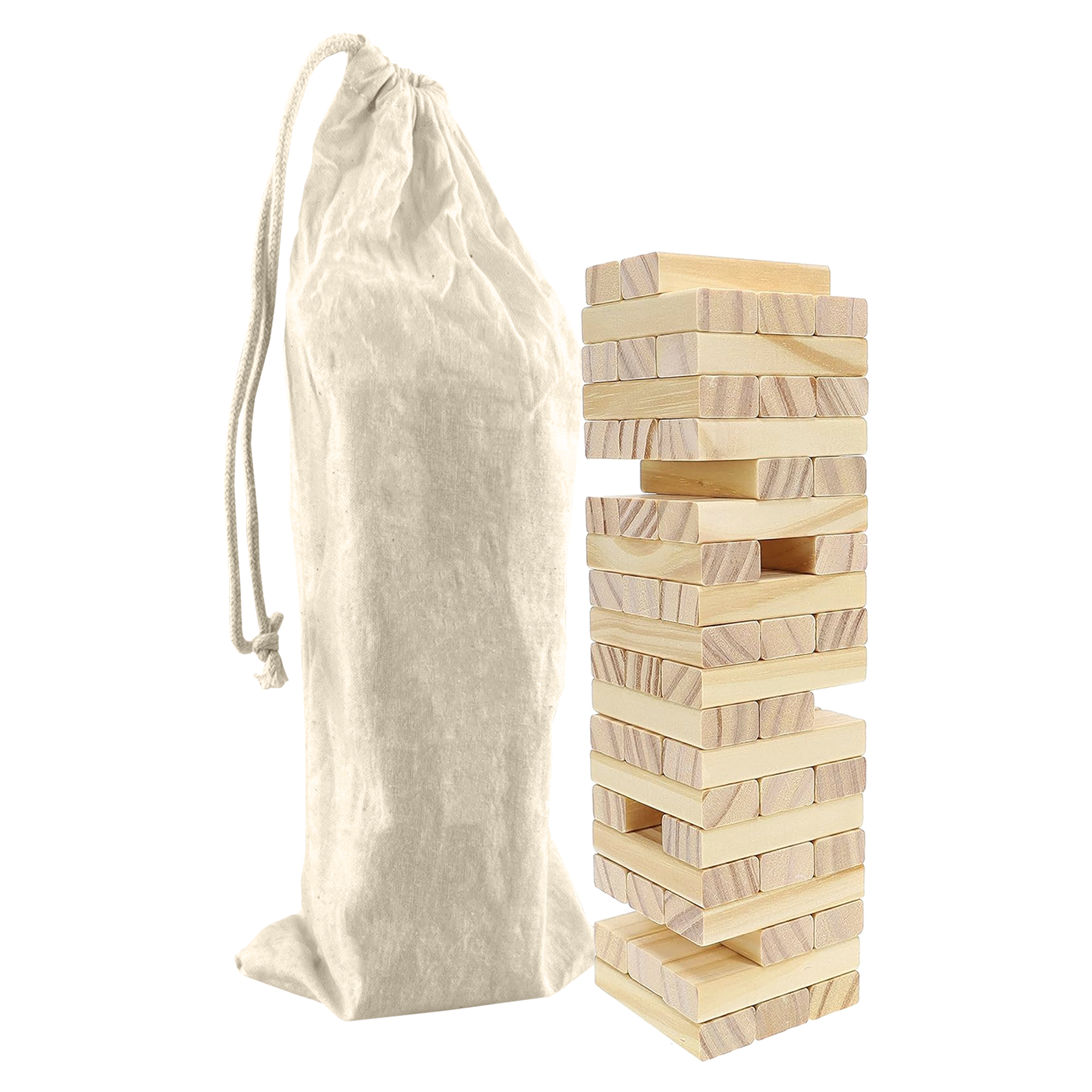 Small Janga Set is constructed by 54 wooden blocks and is a game of providing hours of fun for kids and adults alike. Whether you’re hosting a family gathering or having a backyard BBQ with friends everyone will enjoy playing this classic game together. The players take turns removing one block at a time without causing the tower to fall. Made from natural durable pine wood and packed in a calico draw-string bag which can also be branded. The blocks are sanded for a smooth finish.