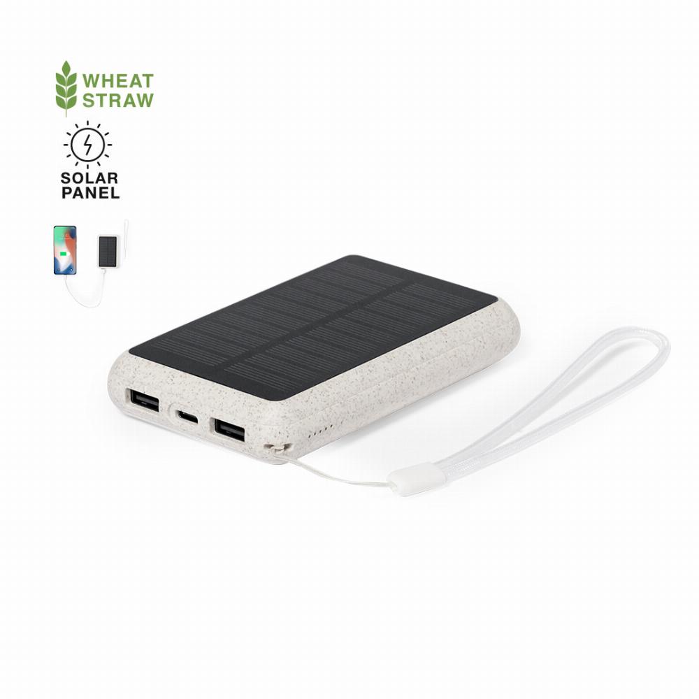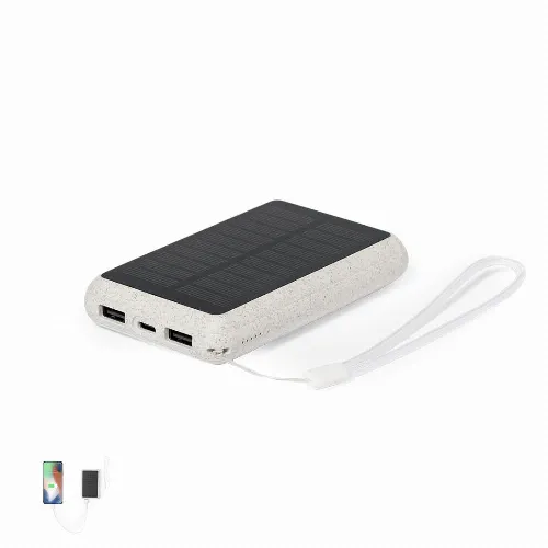 With 5,000 mAh charging capacity, Type C input/output connector + USB outputs. Including photovoltaic panel enabling the battery to be easily recharged in any outdoor space with no need of power connection. Presented in a kraft design box.Type C Input/Output: 5V DC 2.4A, 12W2 USB Outputs: 5V DC 2.4A, 12WThe capacities shown in all our external auxiliary batteries are real, all of them incorporating non-recycled, grade A batteries, with a service life of at least 500 charging cycles, and complying with CE regulations. In addition, they are manufactured according RoHS standards, and in compliance with the following safety requirements: Power bank overcharge protection system. Complete discharge protection system, which increases the durability of the power bank. Blocking system to prevent short circuits. Constant charging transfer system, in accordance with the capacity of the target device.