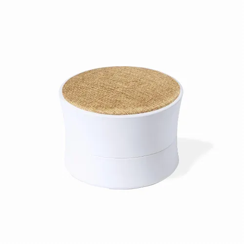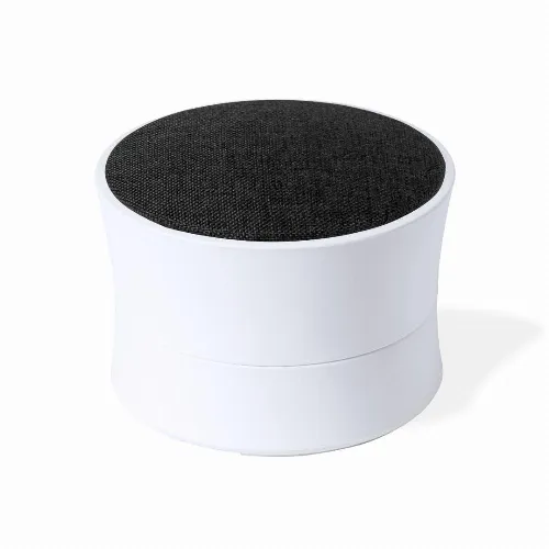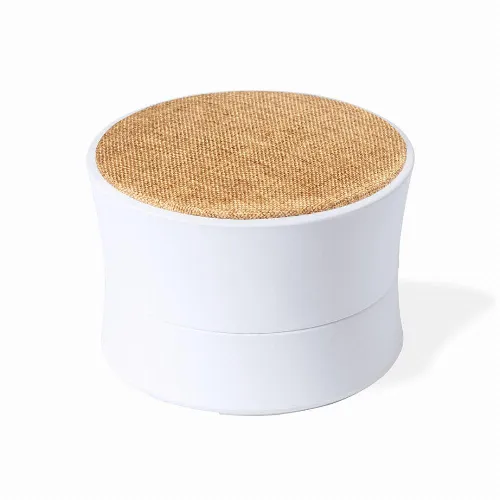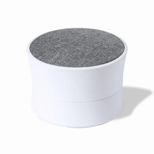 Combination of white ABS body with polyester and polyester grille in a wide range of colours. 300mAh lithium battery, with Type C charging cable included. Presented in an individual kraft design box, with instruction manual in English and Spanish.