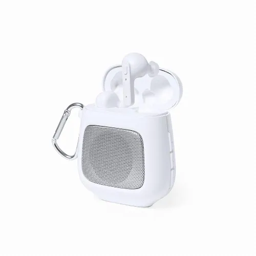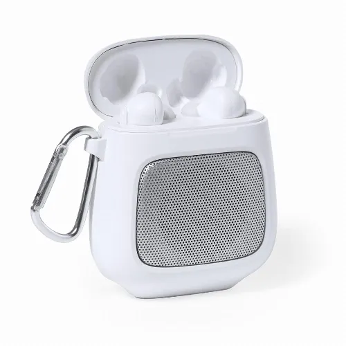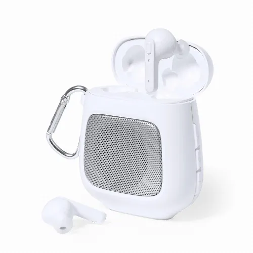 The set includes a Bluetooth® speaker with 3W power, hands-free function and carabiner. It is completed by a pair of earphones with integrated control button and 30 mAh battery each. 600 mAh charging base, with LED charging status light. Individually packaged in a kraft box, with instruction manual in English and Spanish.Manufactured according to RoHS standards and in compliance with the following safety requirements: Overheating protection system. Over-charge protection system. Blocking system to prevent short circuits.
