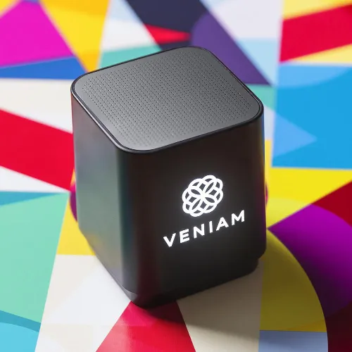 Speaker with Bluetooth® connectivity, inside LED light and body especially designed for laser printing, illuminating the logo.
