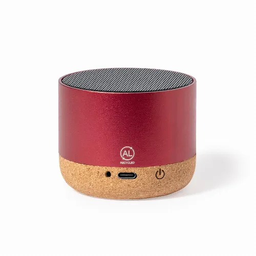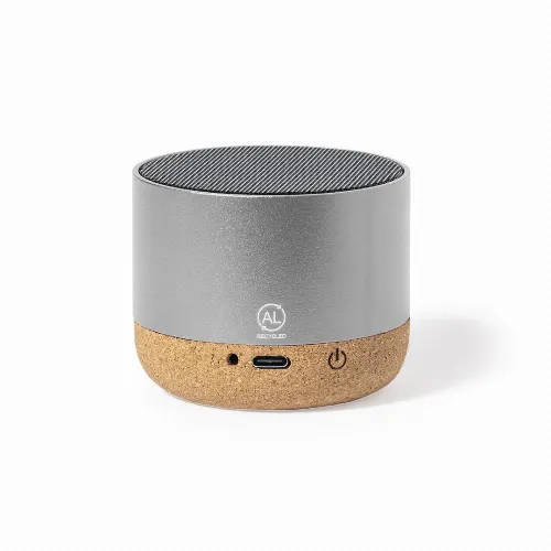 Speaker made in eco combination of recycled aluminium casing and natural cork base.