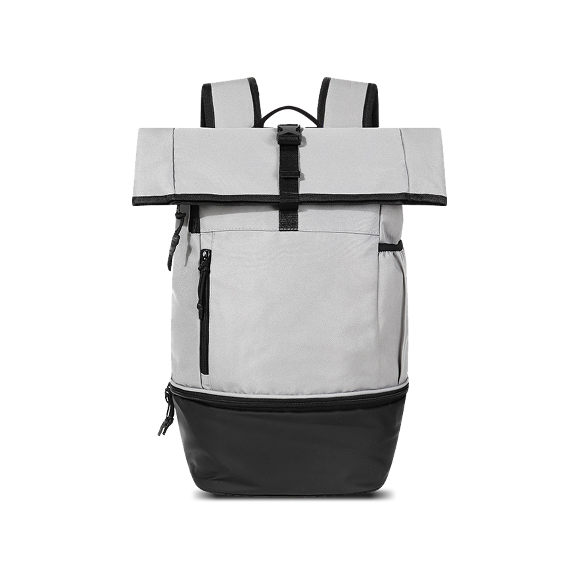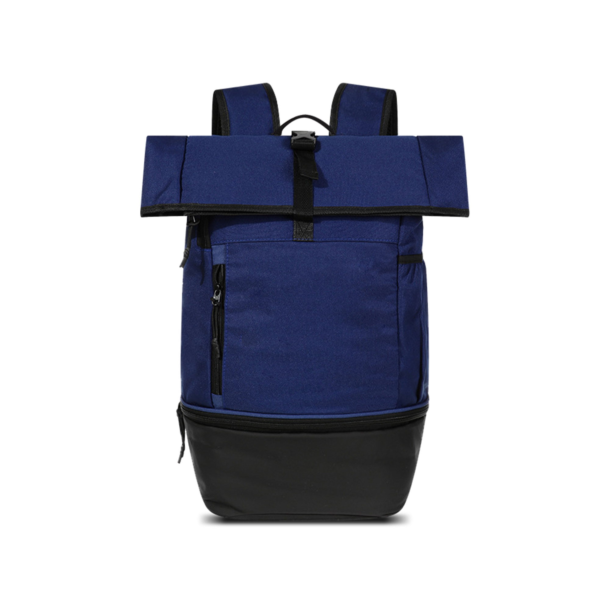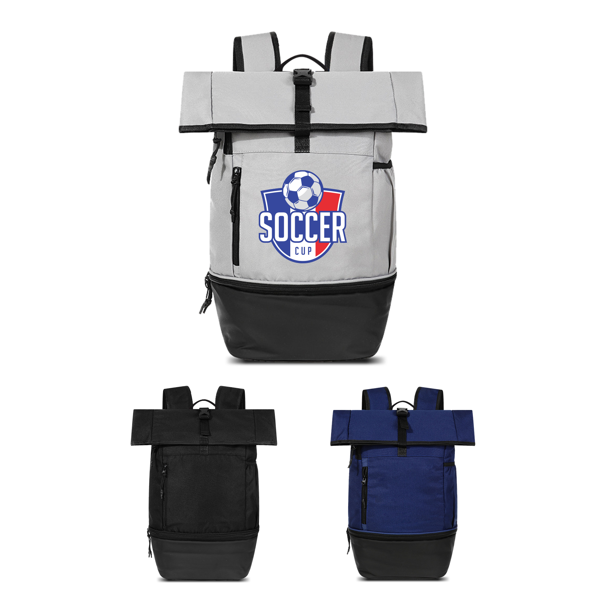 This Sports Roll Top Backpack can conveniently adjust its capacity, and fits up to your 15″ laptop, featuring a front zipper pocket for essentials, a bottom zipper pocket for shoes, 2 side pockets for bottles and a main pocket with Velcro. Our quality backpack is made of Oxford material, that is water resistant and durable. With full colour heat transfer to showcase your design, you can choose 3 colours, black, denim blue and light grey.