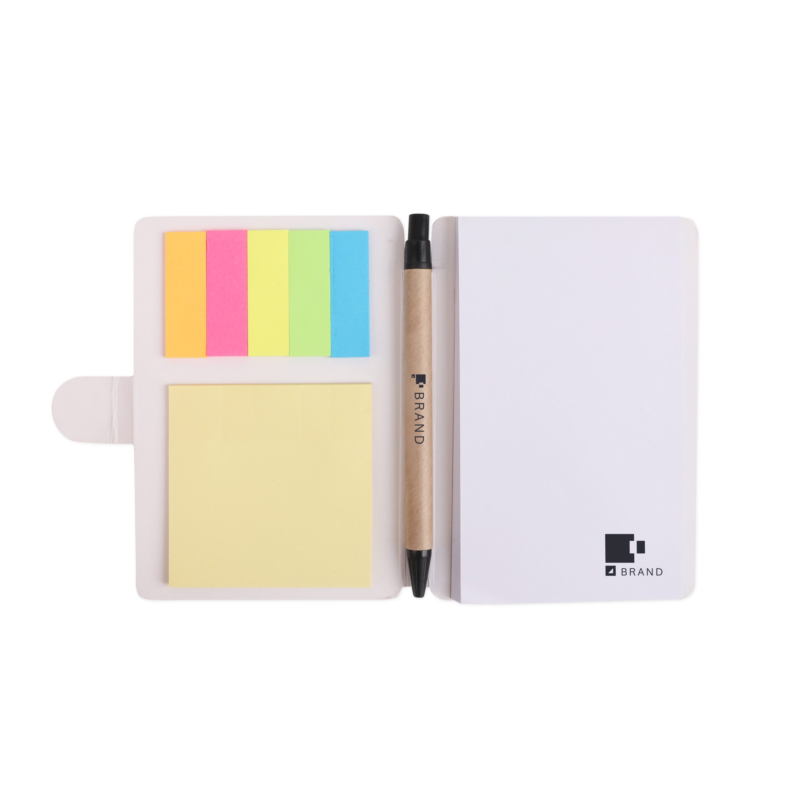 - Made from a 500GSM cardboard cover, 50 page note pad, a 25 page pad of adhesive notes and five different coloured adhesive flags