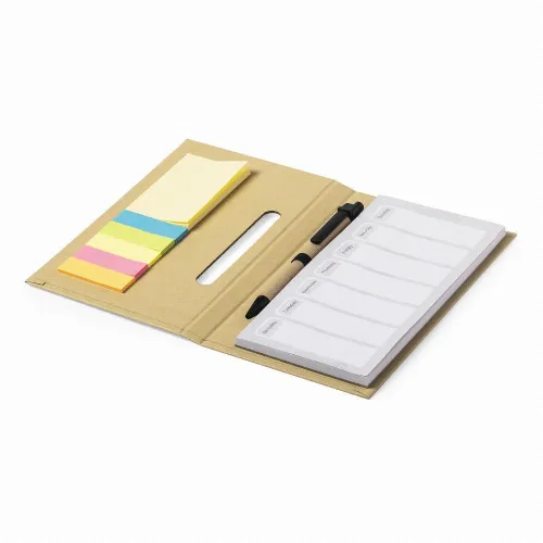 Hard covers in recycled cardboard, with ball pen holder and 60 sheets for weekly planning. Including 25 medium sized adhesive notes and 125 mini adhesive notes. Ball pen with push-up mechanism, with body in recycled cardboard -blue ink-.