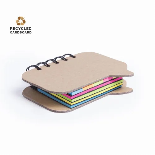 Original ring sticky notepad with sandwich design and soft-touch covers in resistant, rigid recycled cardboard.