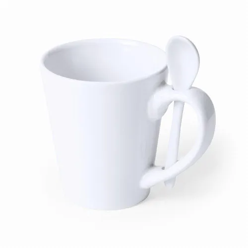 350ml ceramic mug in white color and with built-in ceramic spoon in the handle.