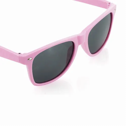 Durable frame with a stylish design and glossy finish, in a variety of fun colours. Black lenses for guaranteed style. Presented in an individual recycled bag.