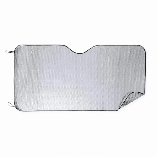 Aluminum sunshade with bubble on both sides in silver metallic finish with black piping.