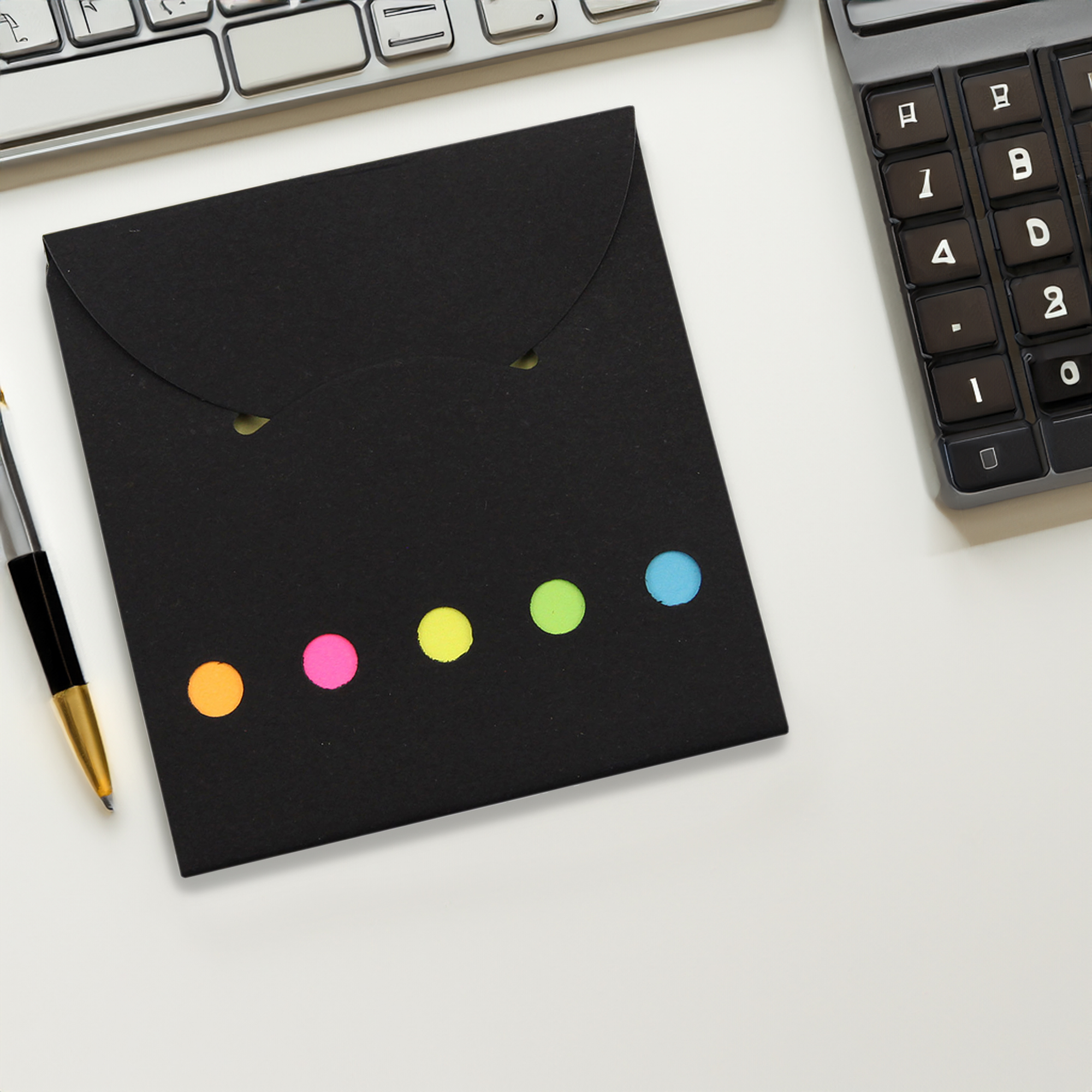 Sticky flags and note in a pocket case it contains a note pad and 5 sticky flags in 5 neon colours and self-adhesive stick to most surfaces. NFC is available for add on!