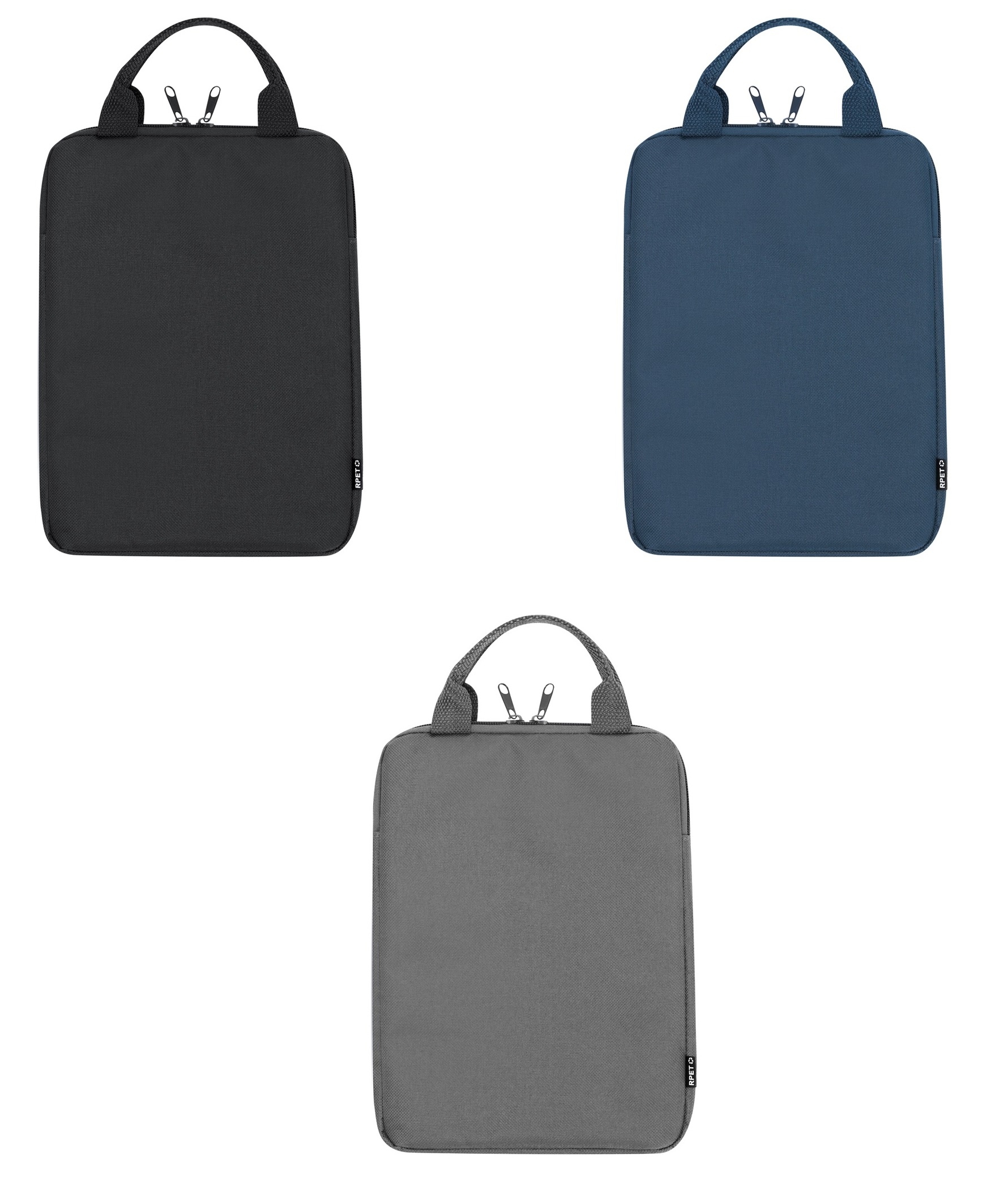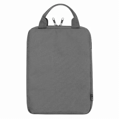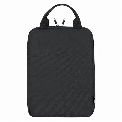 Top opening, with zip closure, metal pullers and carrying handles. For tablets up to 10 inches. Outside label with RPET logo.RPET material is made from recycled plastic, thus promoting the reuse of plastic waste and helping the sustainability of the planet.