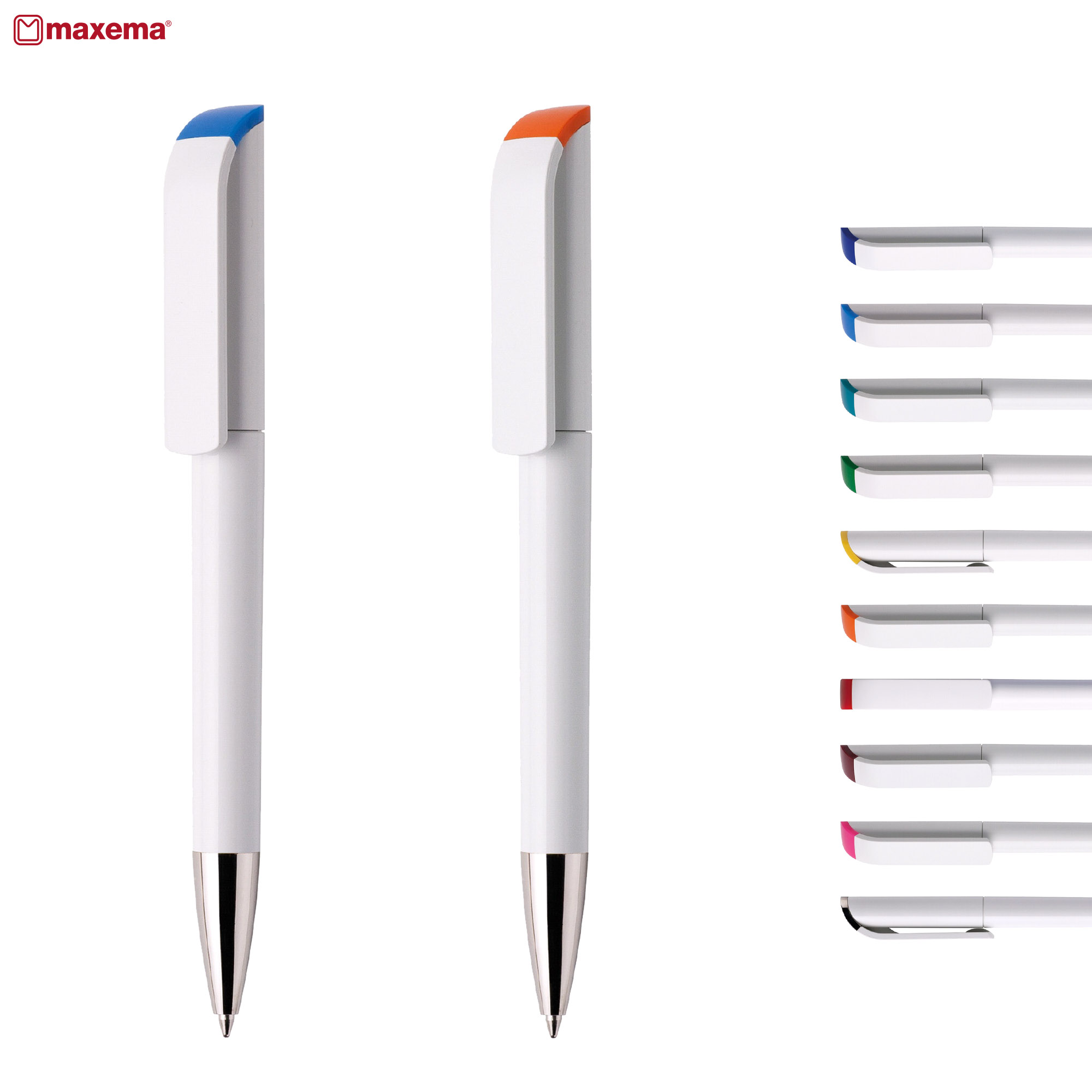 Maxema a premier Italian brand renowned for precision and elegance. The Tag a pen crafted to epitomize perfect elegance devoid of unnecessary adornments. Its design exudes a sense of precision yet incorporates softer lines in its clip and closing plug distinguishing it with a unique touch. Offering ample space for personalization The Tag boasts the widest clip in the Maxema pen lineup. The white barrel complemented by a matte finish tip and clip along with a colourful upper plug exudes sophistication. Operated via twist-action and constructed from non-toxic highly resistant ABS plastic it accommodates a jumbo refill available in black or blue ink capable of writing up to 2500 meters. Italian Design and Make. Exclusive to Dex Collection in Australia and New Zealand. 1000 units minimum per colour.