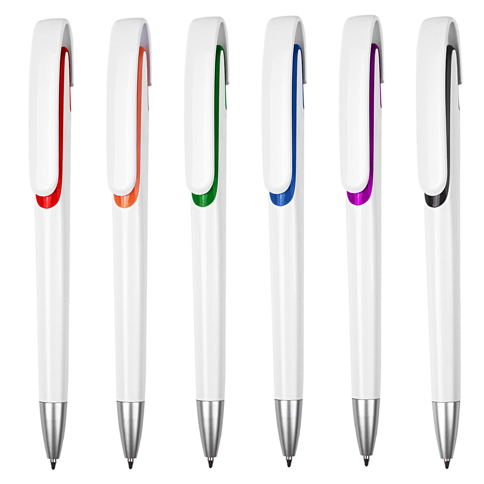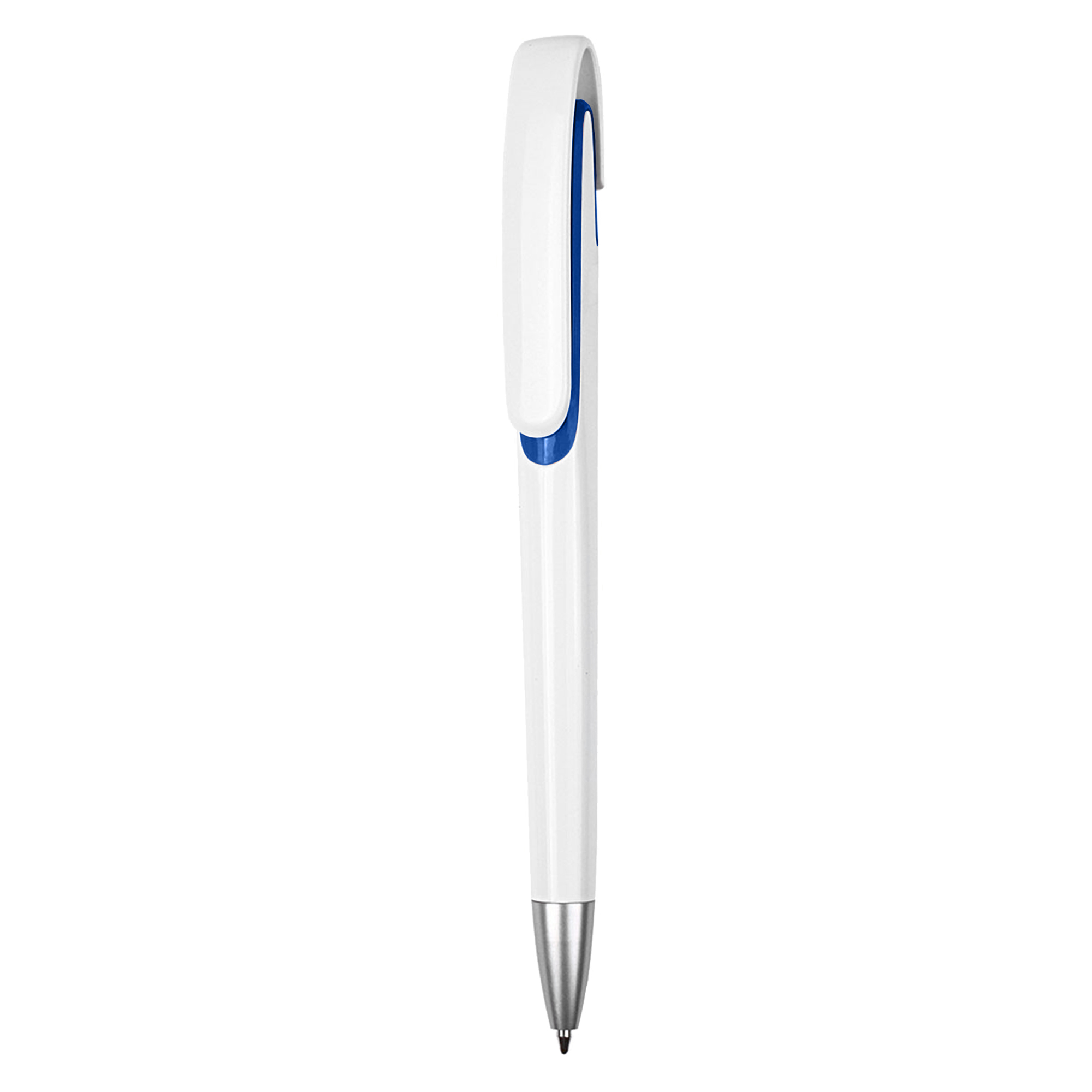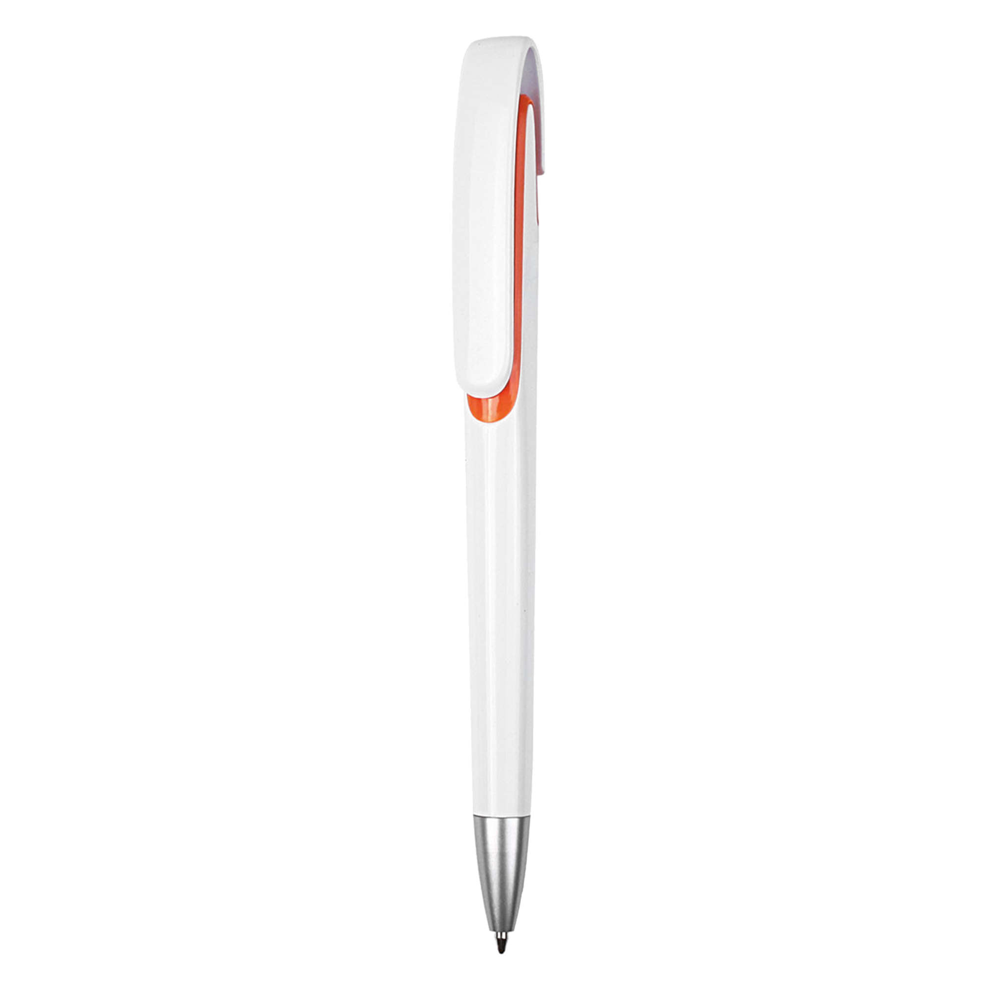 Click action plastic pen with broad printing area on clip white opaque barrel and clip a small coloured panel beneath the clip which highlights the pen design matt silver chrome tip. It has high quality German manufactured black ink refill 1800 meters writing distance tungsten carbide ball provides you with quality writing.