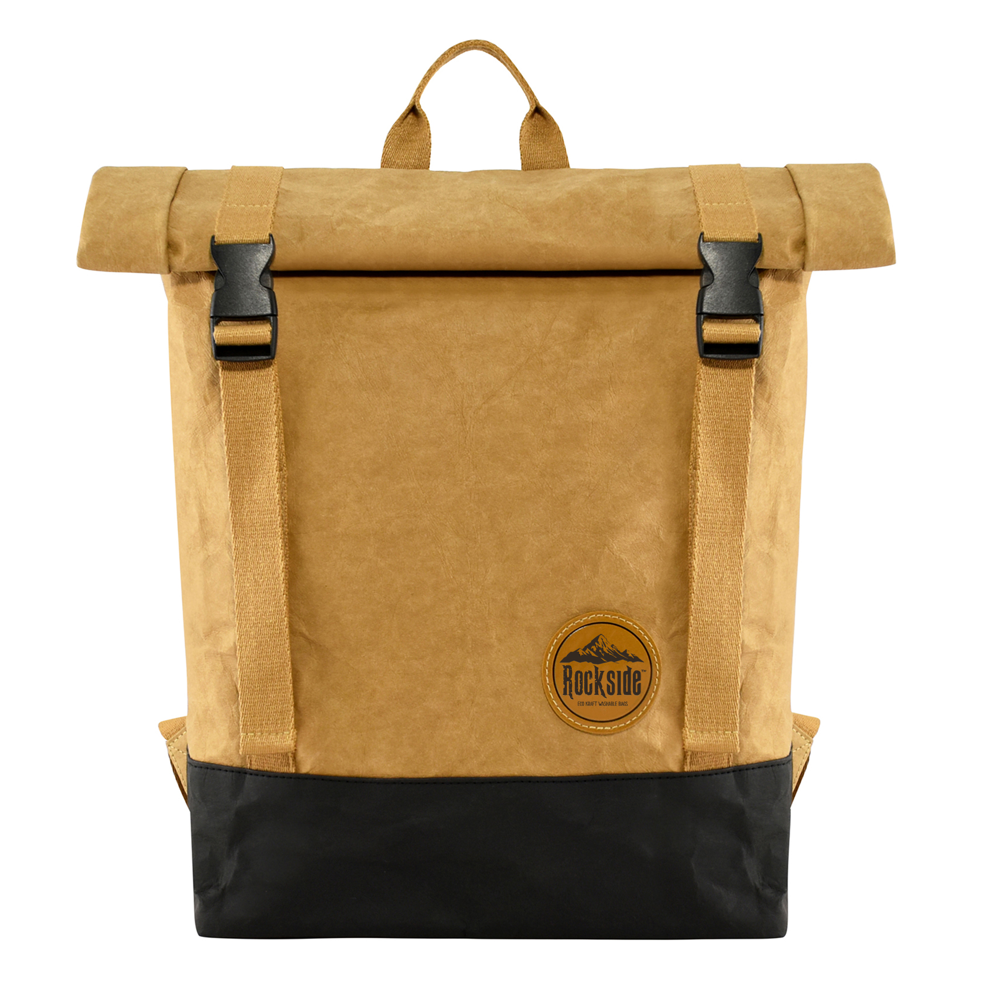 The fashionable black bottom design Base Kraft Paper Laptop Backpack combines durability functionality and style making it suitable for various purposes. The combination of washable kraft paper and canvas materials lining gives it a unique and modern look. The multiple interior pockets including the laptop compartment provide ample space for organizing essentials while the adjustable shoulder straps ensure a comfortable and customizable fit. The double brown polyester cotton webbings with black plastic buckles offer both style and practicality in securely closing the backpack. It is made of German 0.55mm pre-washed brown and black washable kraft paper. Note that this item comes stock with the “Rockside” brand on front leather patch.