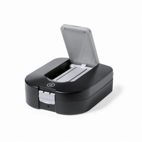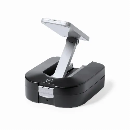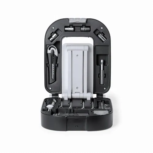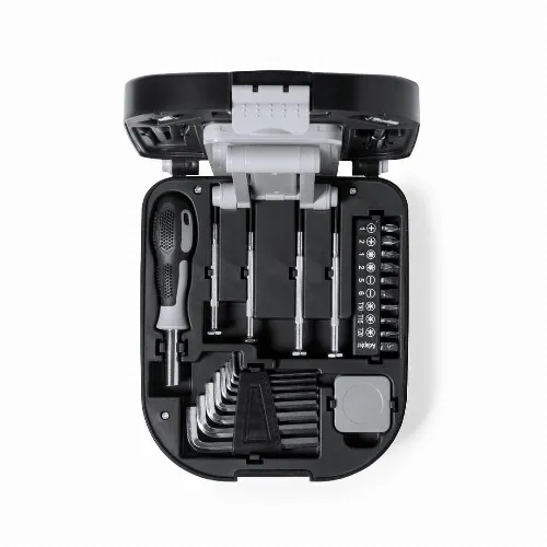 Presented in a durable black ABS box with closure. Foldable lamp integrated in the box, with 24 LEDs and ON/OFF button. Includes screwdriver with many flat, philips, torx tips precision screwdriver kit tube spanners allen spanners in different sizes cutter and 1m flexometer. Battery-powered lamp (3xAA not included). Presented in an individual box with kraft design.
