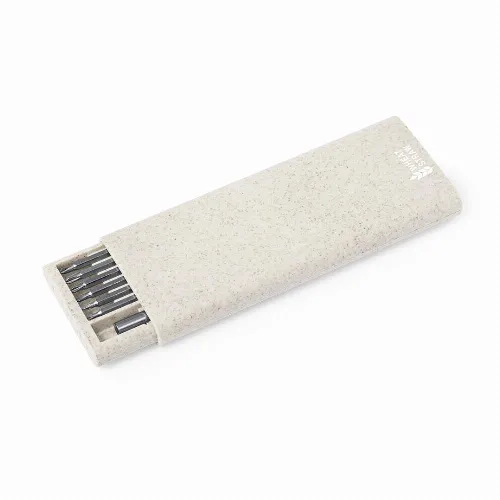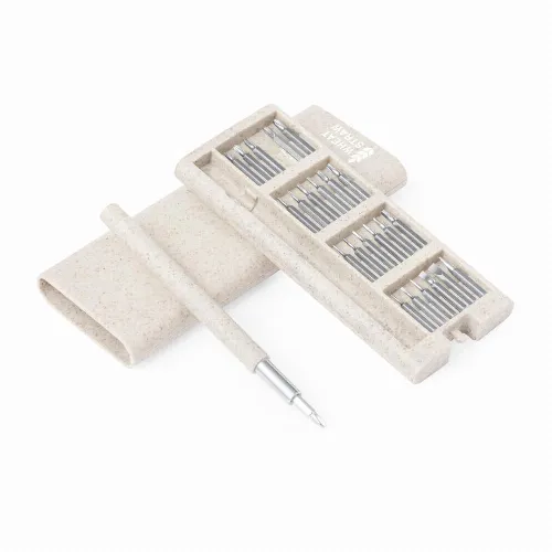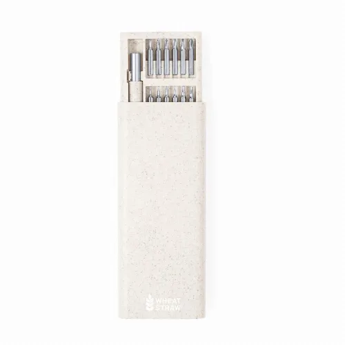 Includes a precision screwdriver with 24 accessories, consisting of various bits: philips, allen and flat bits. With a wheat straw logo included and presented in a kraft design box.Wheat straw promotes the use of natural raw materials, thus reducing pollutant emissions.