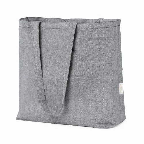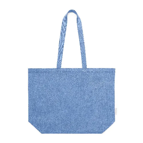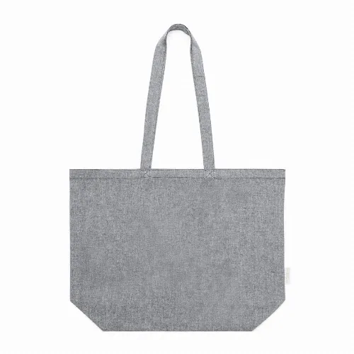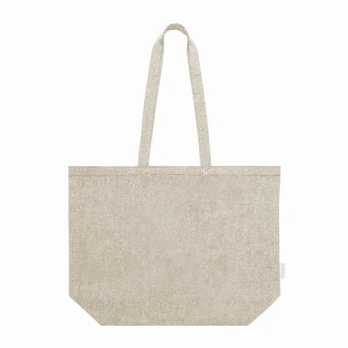 Stitched finish and with long reinforced handles (70 x 2,5cm). Gusset on base and available in natural and black colours, with recycled cotton label on the outside. Resistance up to 6 kg in weight.GRS (Global Recycled Standard) certification available, guaranteeing the recycled origin of the material used to manufacture the product.