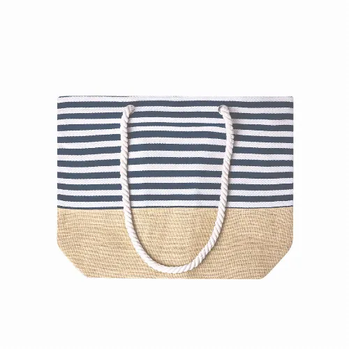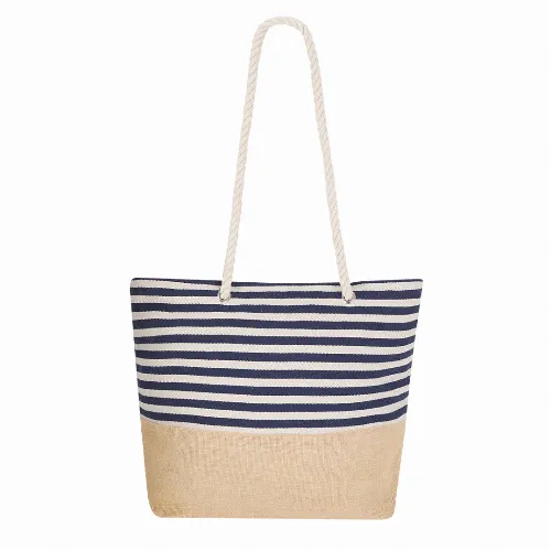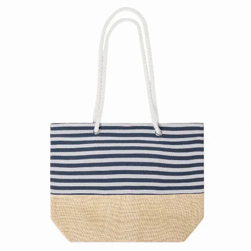 Stitched finish and zip closure, with distinguished blue and white striped design. Long handles made of white cotton in rope style, reinforced with eyelets. Resistance up to 13kg in weight.