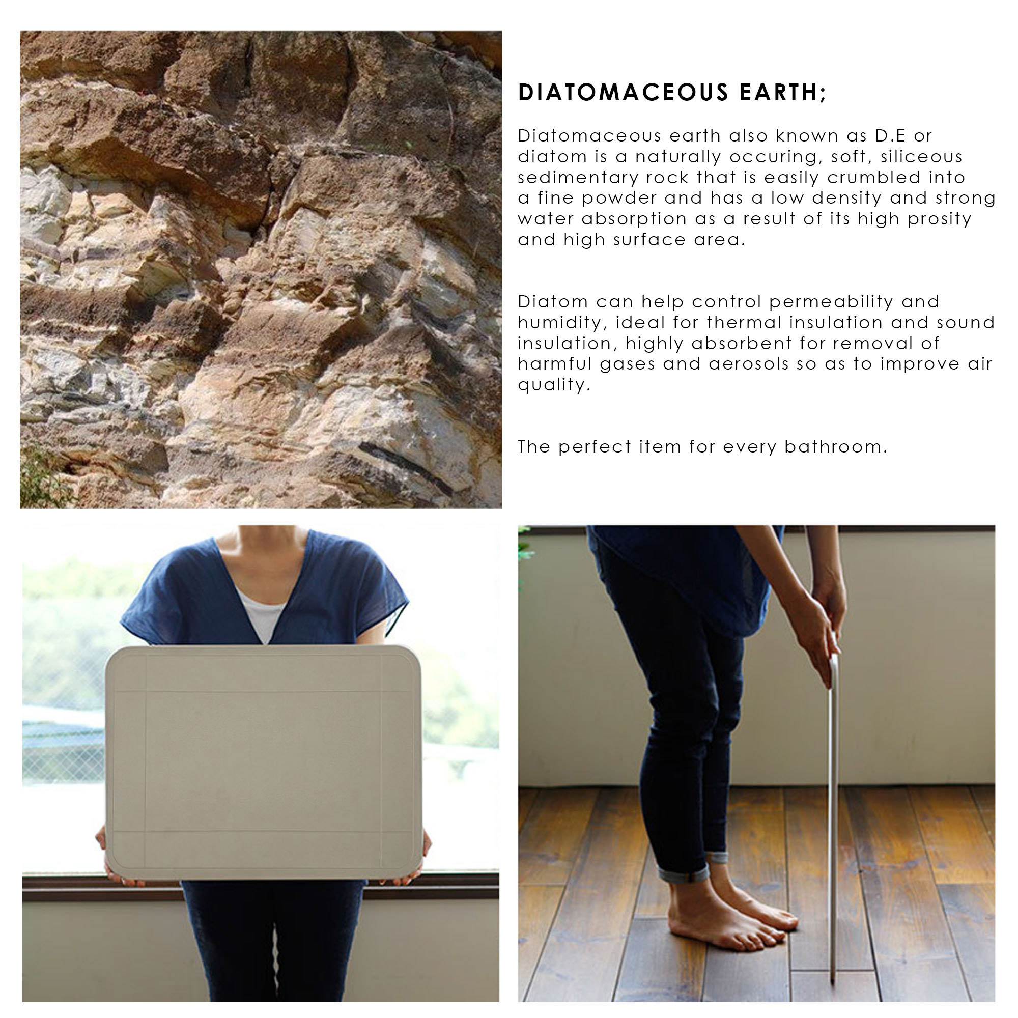 TOYO I-DRIED BATH MAT is made of ancient phytoplankton (diatoms) as raw materials which has functions as super absorbent – about 78%-80% water absorption antibacterial deodorant non-slip and so on. You won’t have to worry about getting your floor wet after you come out of the bathroom . The water on your feet can quickly suck away . When your feet leave the bath mat the wet footprints will disappear within 15 seconds. The strong water absorption ability and Good anti-skid performance could become your a perfect bathroom partner. The Diatomaceous mat does not add any harmful substances and bleach natural green material of it effectively prevent the propagation of bacteria. It’s the best choice for millions of families! It is so easy to take care of it when there is stains on the surface washing it by water and use sandpaper gently grinding the surface until removed then let it dry naturally the quickly renewing bath mats looks the same as the new one.