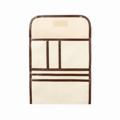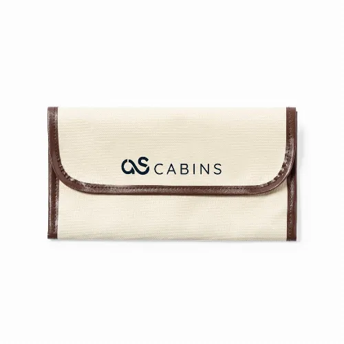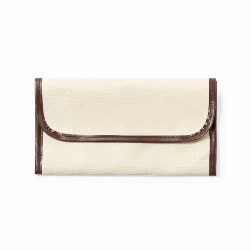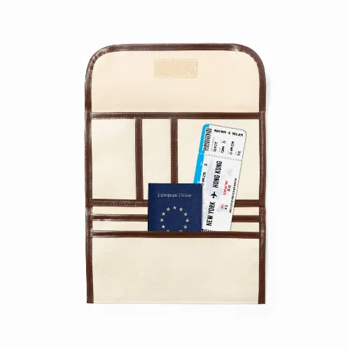 Travel document holder made of durable 600D in natural finish, with brown PU leather piping and reinforcements.