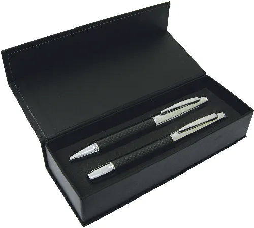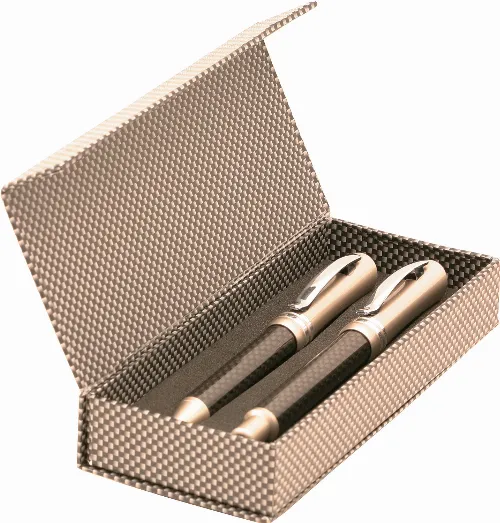 Twin cardboard pen box with magnetic fold over grip. Foam insert suitable for two pens. Pens not included.