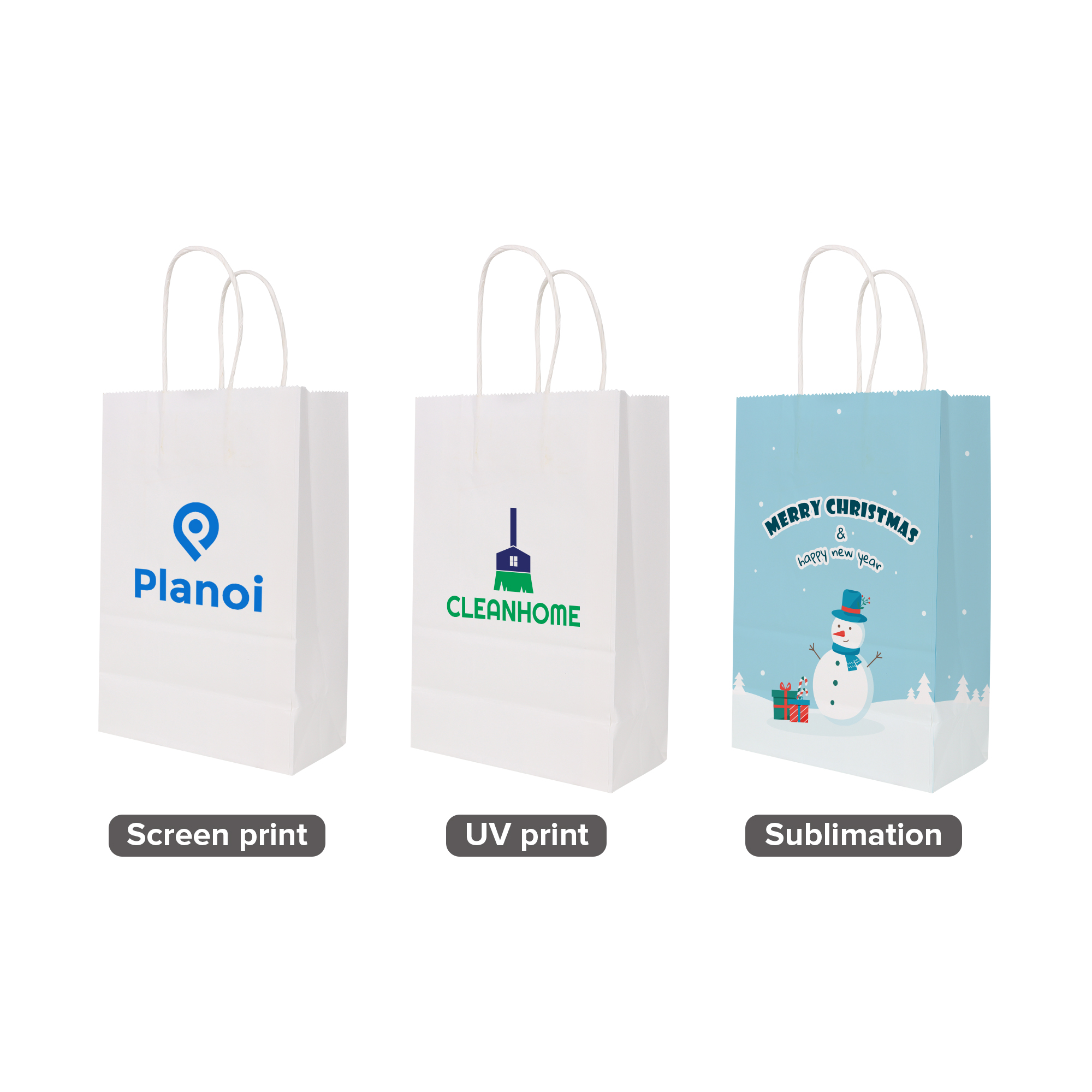 Kraft paper bags with twisted handle, are available in different sizes to suit all your needs. Ideal for giveaway promo. Can be ordered unprinted or custom printed, with either screen print, digital uv print,and sublimation available. Add on stickers are also available in different shapes. Offered in a variety of paper weights, bag dimensions and designs to meet your needs. For any other specifications feel free to contact us with your requirements.
