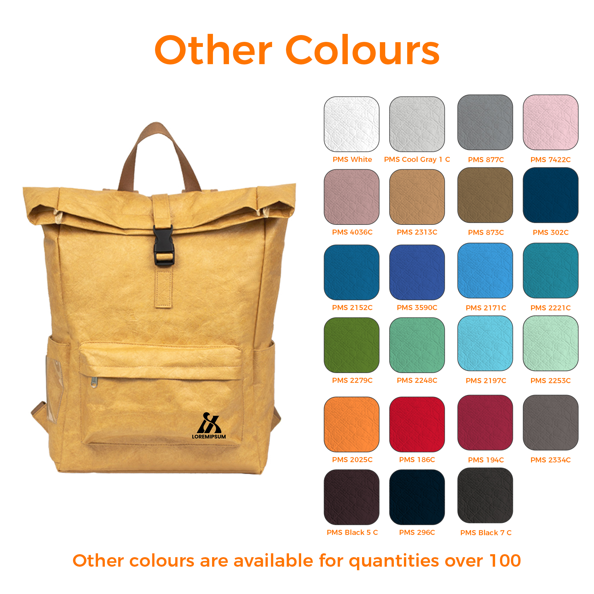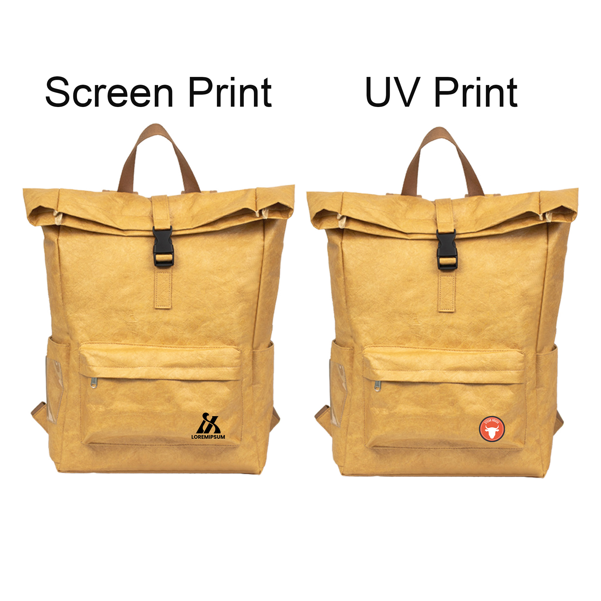This stylish Tyvek Roll Top Backpack can conveniently adjust its capacity, and fits up to your 15″ laptop, featuring a front zipper pocket for essentials, 2 side pockets for bottles and a main pocket with a fastening clamp. Our quality backpack is made of Tyvek, that is water resistant, durable and environment-friendly. With screen print or UV print to showcase your design, available in gold, or other colours for orders over 100 pcs.