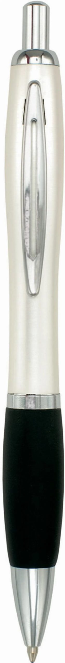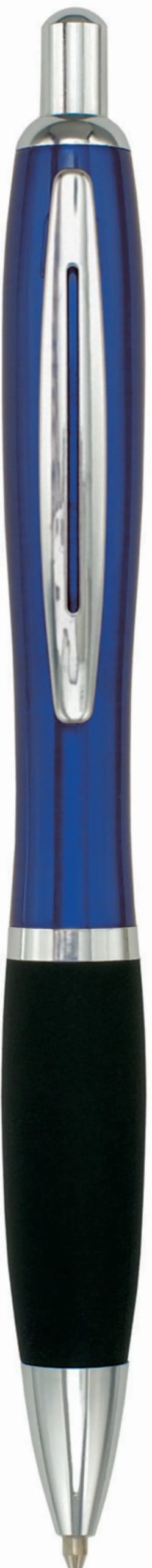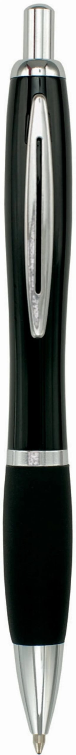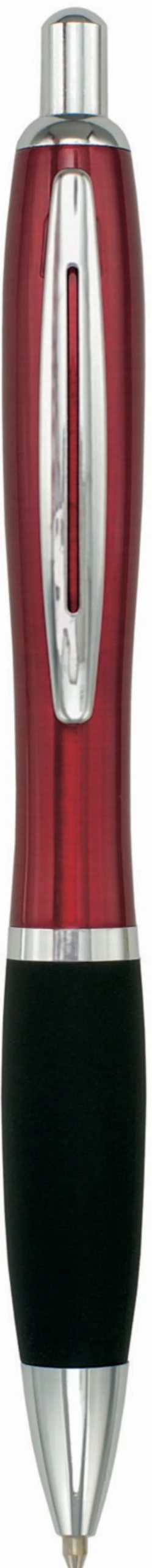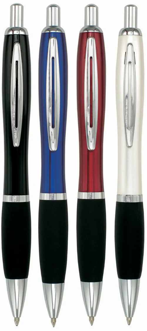 This metal pen has a curvy coloured barrel with a black rubber grip and silver fittings. Parker style black refill.