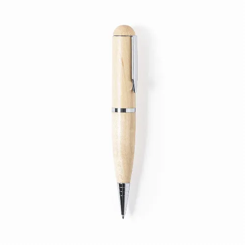With 16GB USB flash drive integrated in the cap and made of wood, to promote the use of natural materials. With twist mechanism and blue ink. Presented in an attractive kraft-finish box.