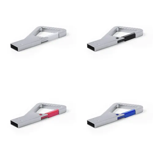 8GB USB flash drive in metal, with original carabiner closure design, in a wide range of tones. Presented in an individual metal case with window and inside soft foam.