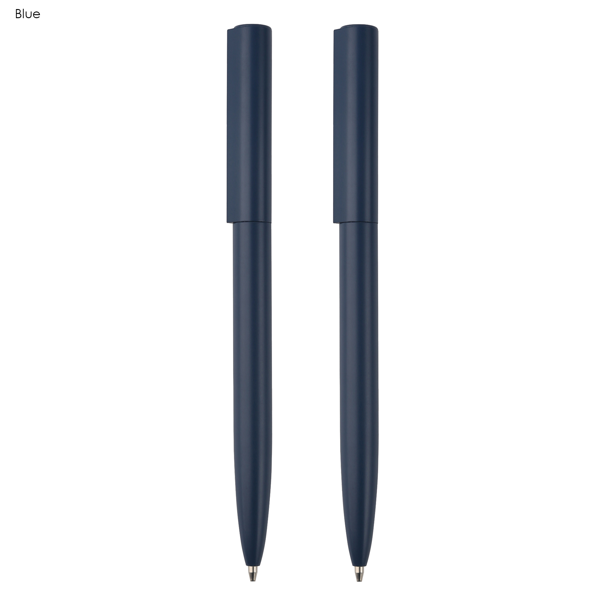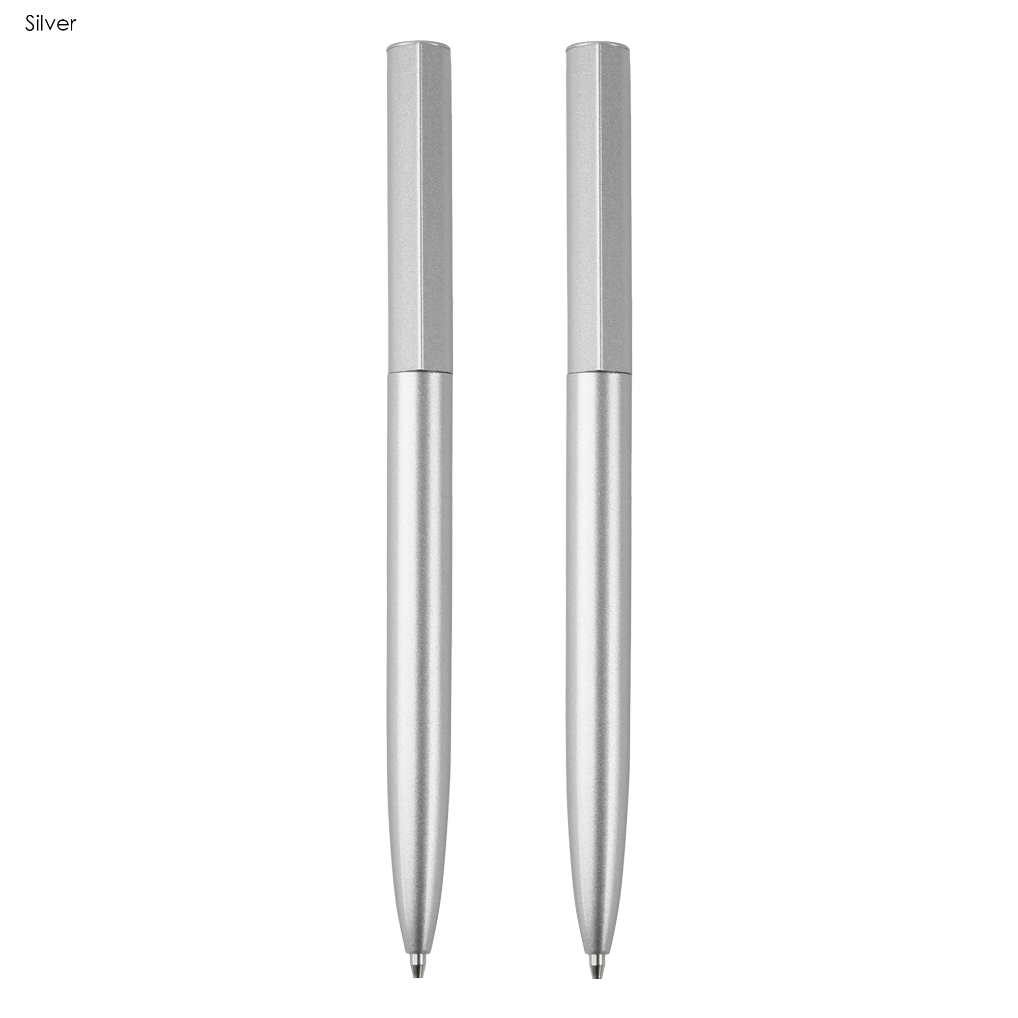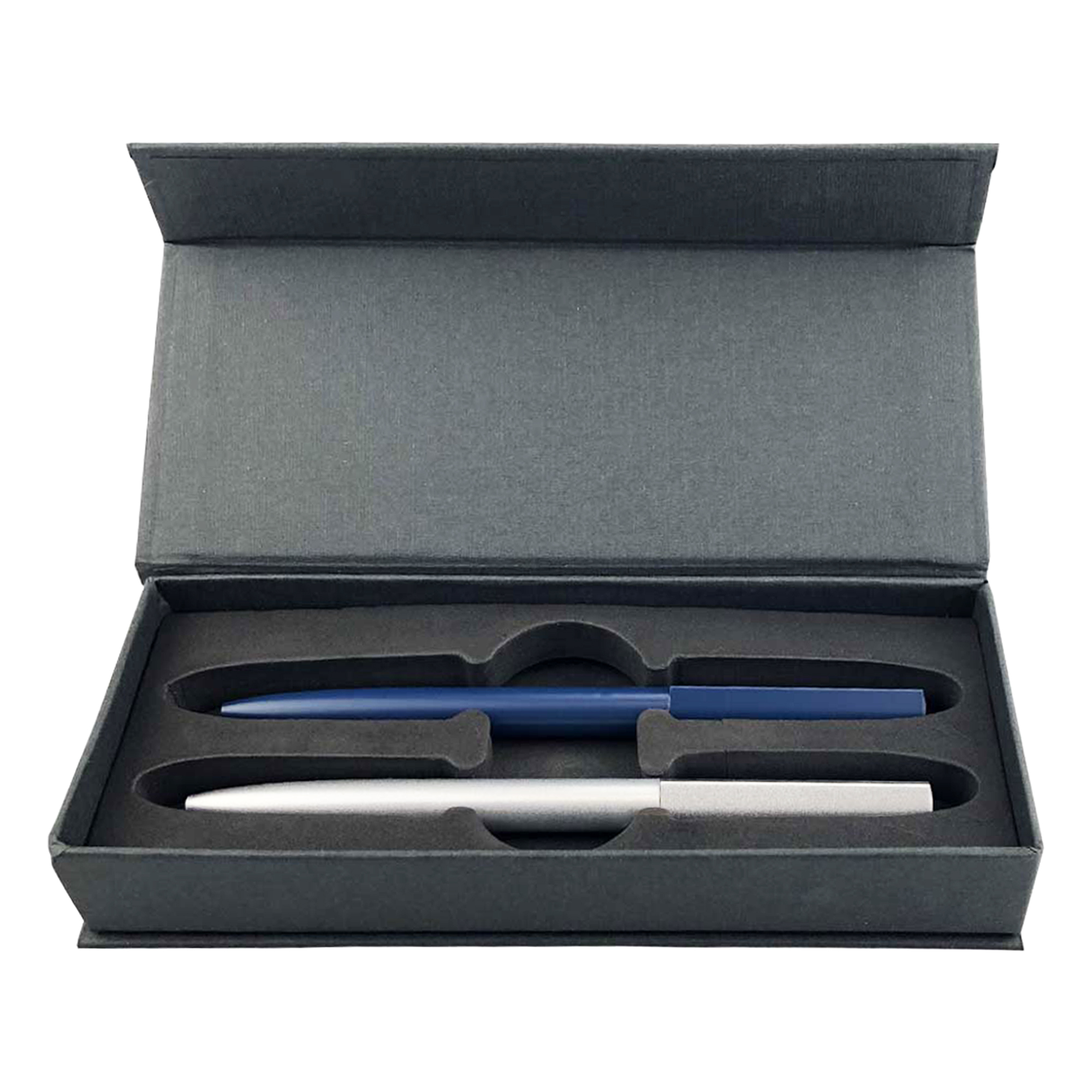 This unique metal pen features a twist action design with a matte finished barrel and a distinct water drop shaped upper barrel, which prevents the pen from rolling off the desk. It is supplied with a metal Parker Type German manufactured black ink refill that offers 1800 metres of writing distance. The tungsten carbide ball ensures smooth and reliable writing quality. Available in a black, blue and silver option, this two pen gift set is beautifully presented in a sleek black cardboard gift box with a custom foam cut out insert.