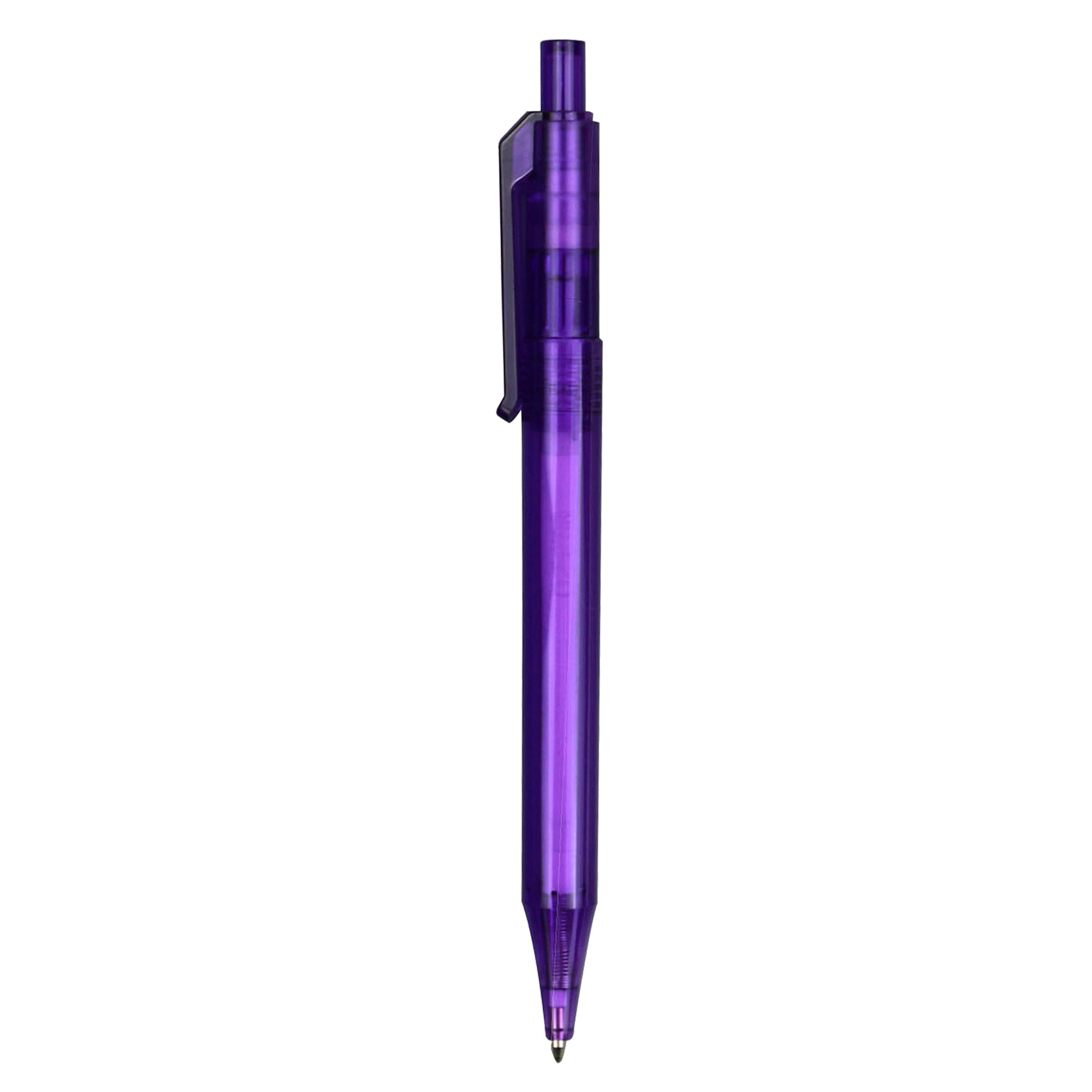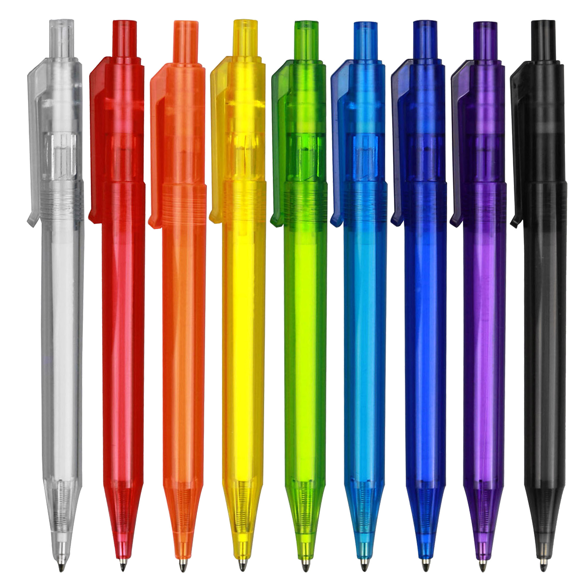 A simple slim and bright transparent coloured plastic pen high quality ABS transparent plastic. Click action with high quality German manufactured black ink and tungsten carbide ball which brings you the better writing quality 1200 meters writing distance.