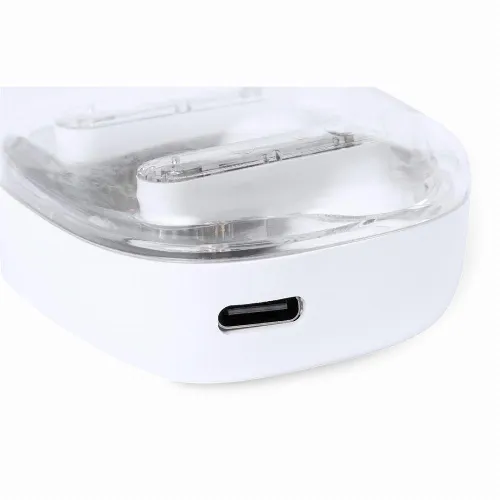 Bluetooth® 5.3 connection and long battery life. Ergonomically designed, with integrated touch control button on the headset, matching charging base and charging status indicators. Hands-free function. Charging port with Type-C input (cable included). Presented in individual kraft design box and recycled bag.
